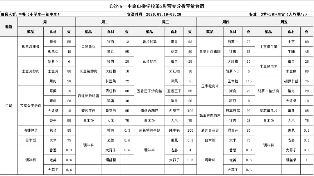 科学配餐、营养健康|长沙市一中金山桥学校第3周食谱