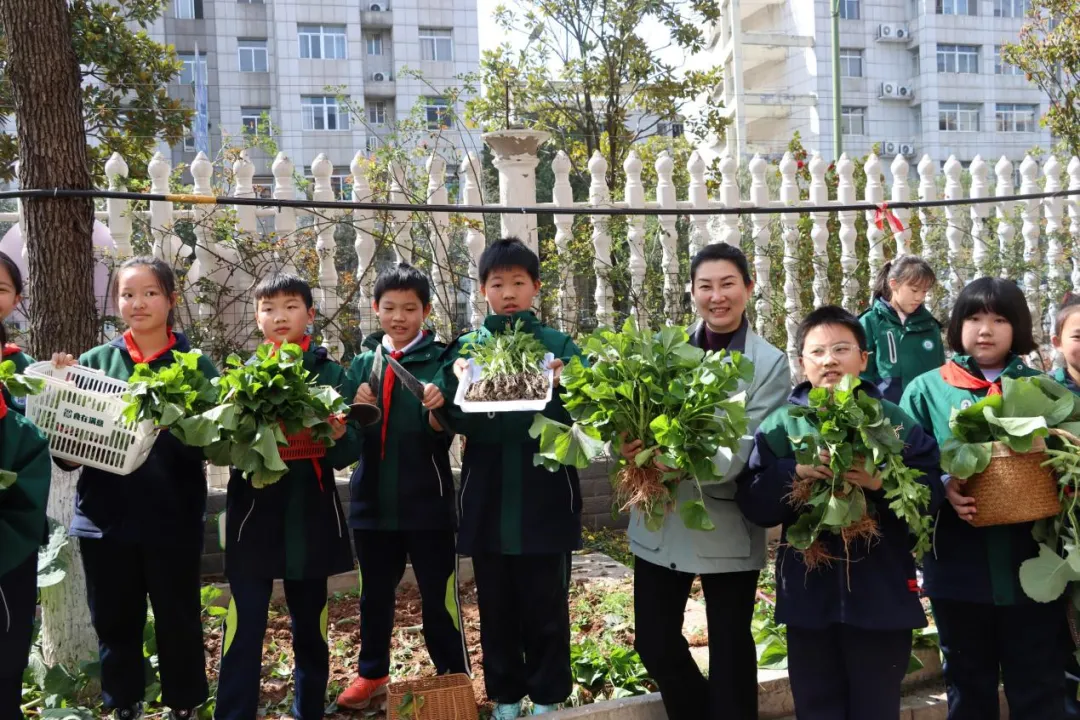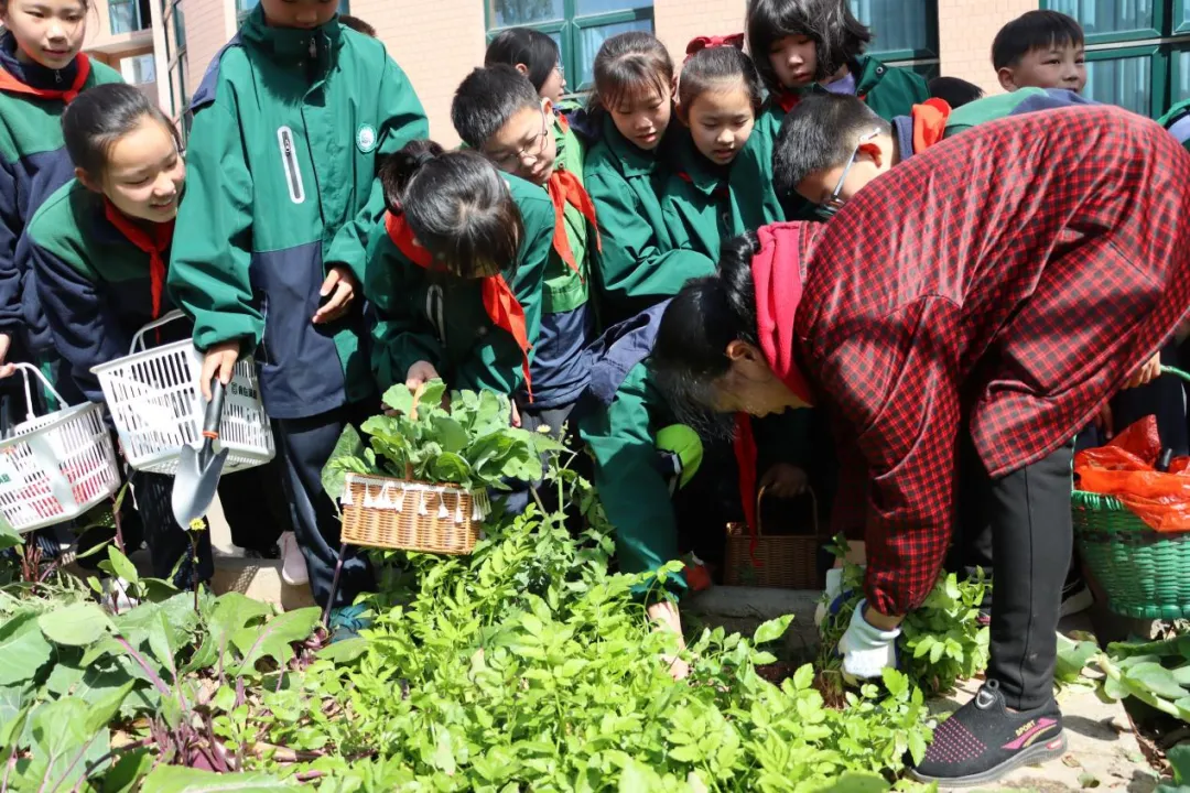 今天上午,校园里格外热闹。学校开展了“植绿护绿守初心,党队同行育新苗”植树节主题实践活动。在党员志愿者和老师们的带领下,孩子们先来到熙园农场,采收去年种下的蔬菜——小心翼翼摘下成熟的菜苔,轻轻放进采收篮里,脸上写满了收获的喜悦。