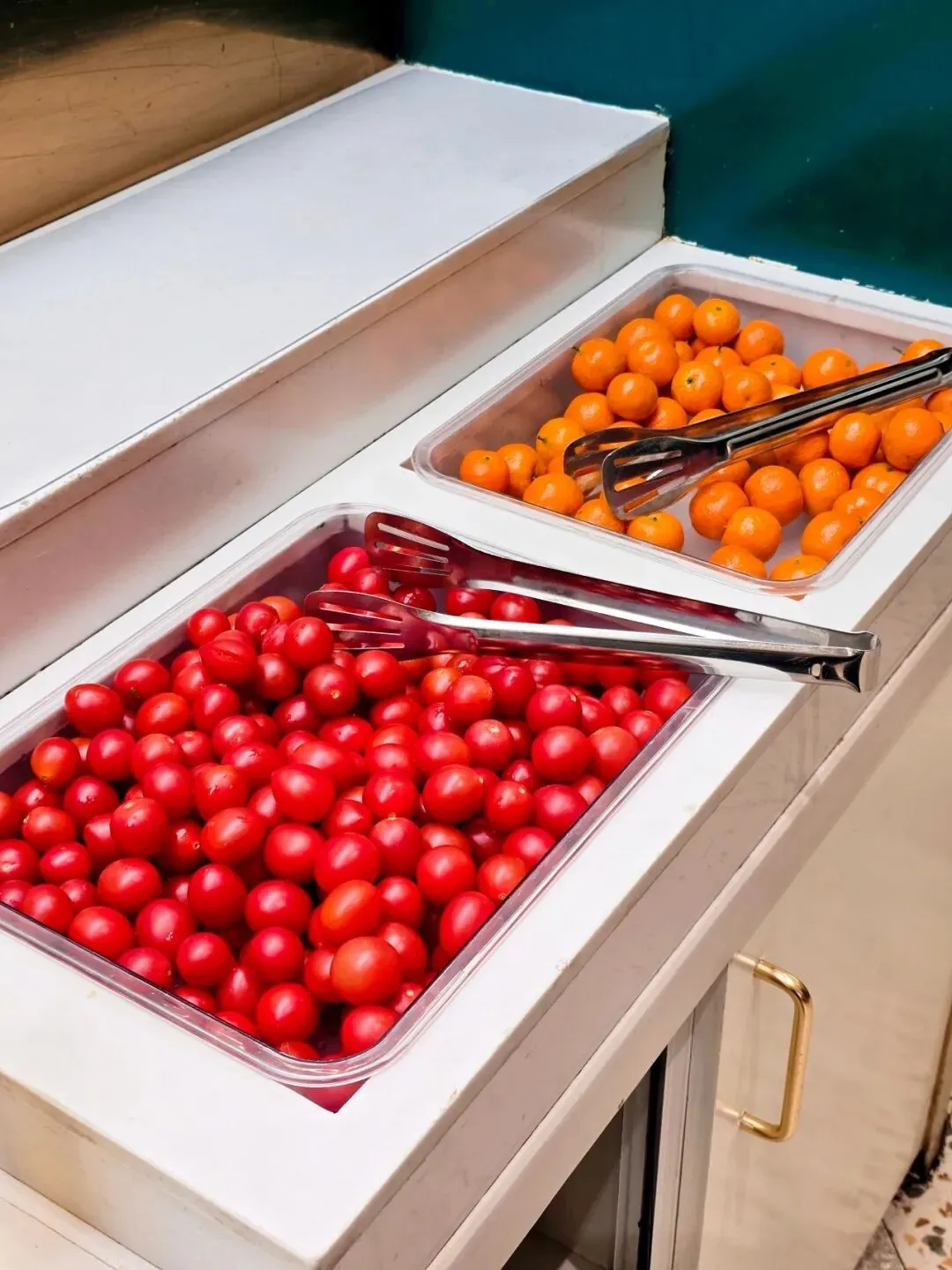 店里的自助小料台,搭配水果和小菜,夏天是西瓜,现在是圣女果和小橘子。