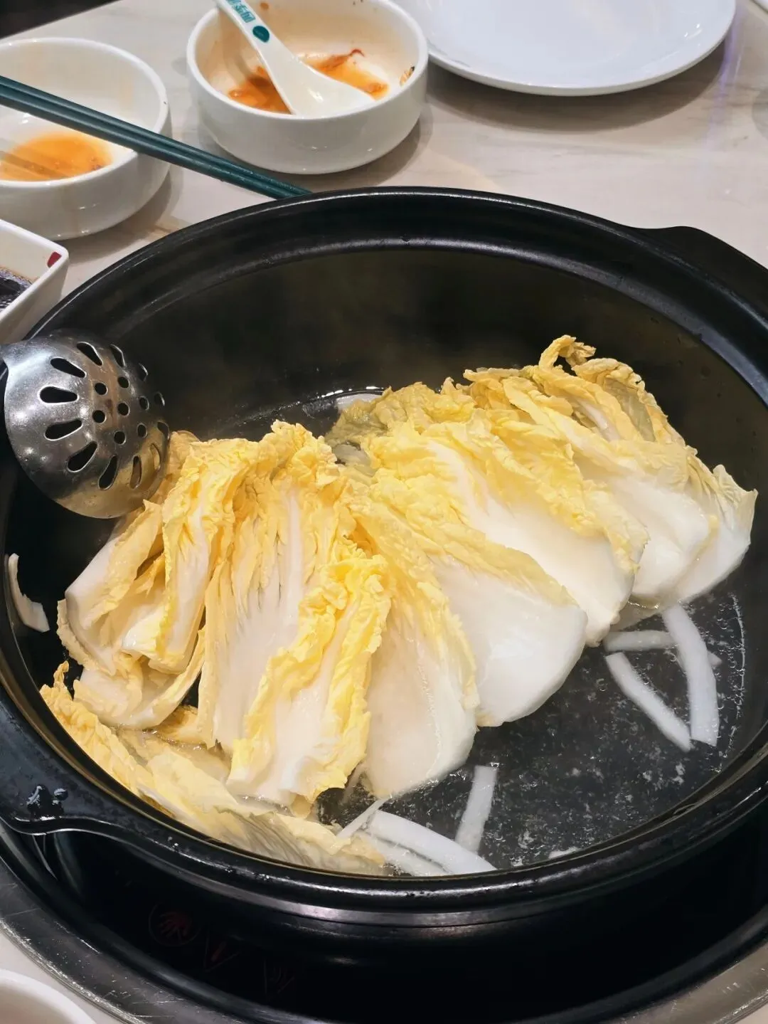 我吃椰子鸡有个小习惯:等待鸡肉吃完,不额外加汤,就用剩下椰子汤下娃娃菜。因为后面加的是高汤,不是椰子水,味道会淡很多,娃娃菜本身会出水,刚好够煮。就这样煮在椰汤里吸满甜味,特别鲜。