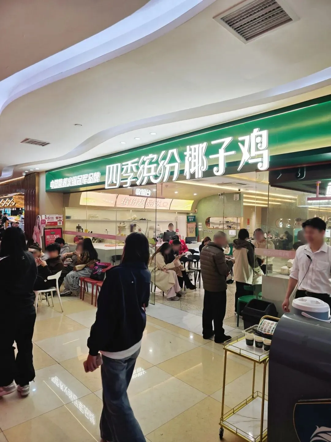 四季缤纷每月有一次会员日,折扣大,人超级多,想省时间的话,建议早点去。另外,忍不住想感慨:椰子鸡对减肥人士实在太友好了,少吃椰肉、少喝汤、多吃去皮鸡肉,热量真的低。
