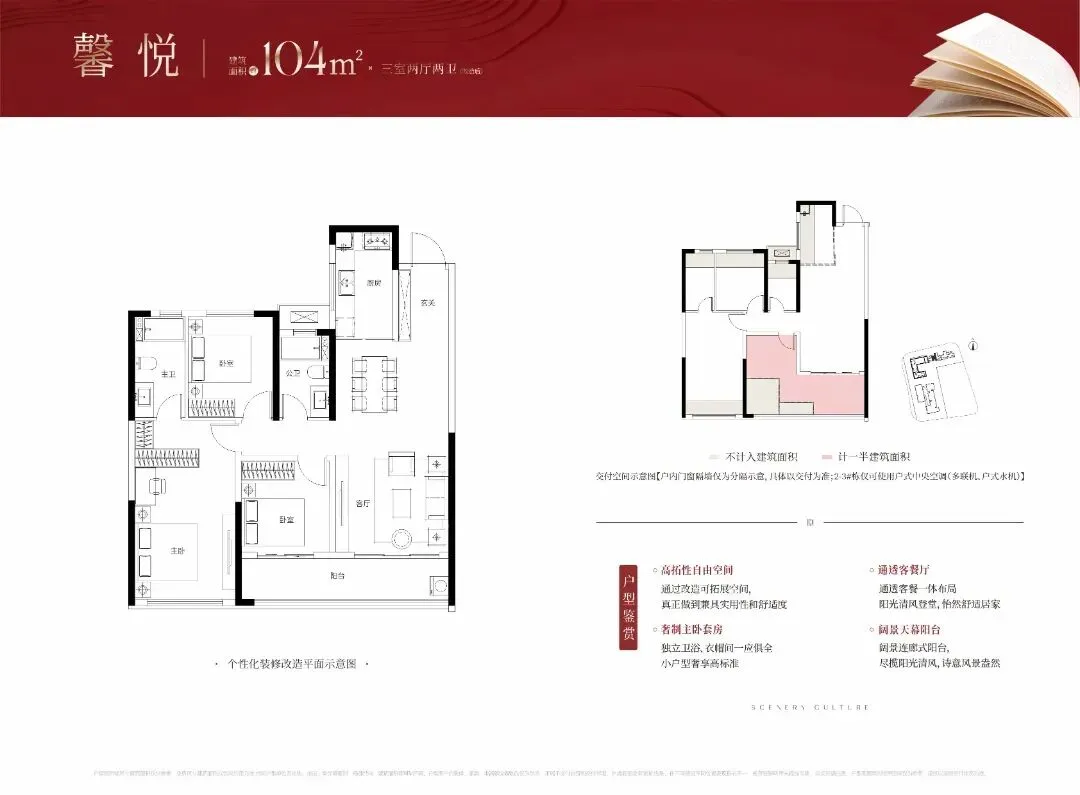 本次推出的约100-139㎡全系户型,采用新规“负公摊”设计,部分户型得房率高达约115%。相较于旧规80%左右的得房率,实际使用率提升约35%,无论是打造亲子互动空间、静谧书房还是藏品储物间,皆可从容实现,性价比冠绝主城。104户型,主卧约26平米,南向阳台开间约6.8米,享阔绰空间及大开间阳台带来的采光效果。
