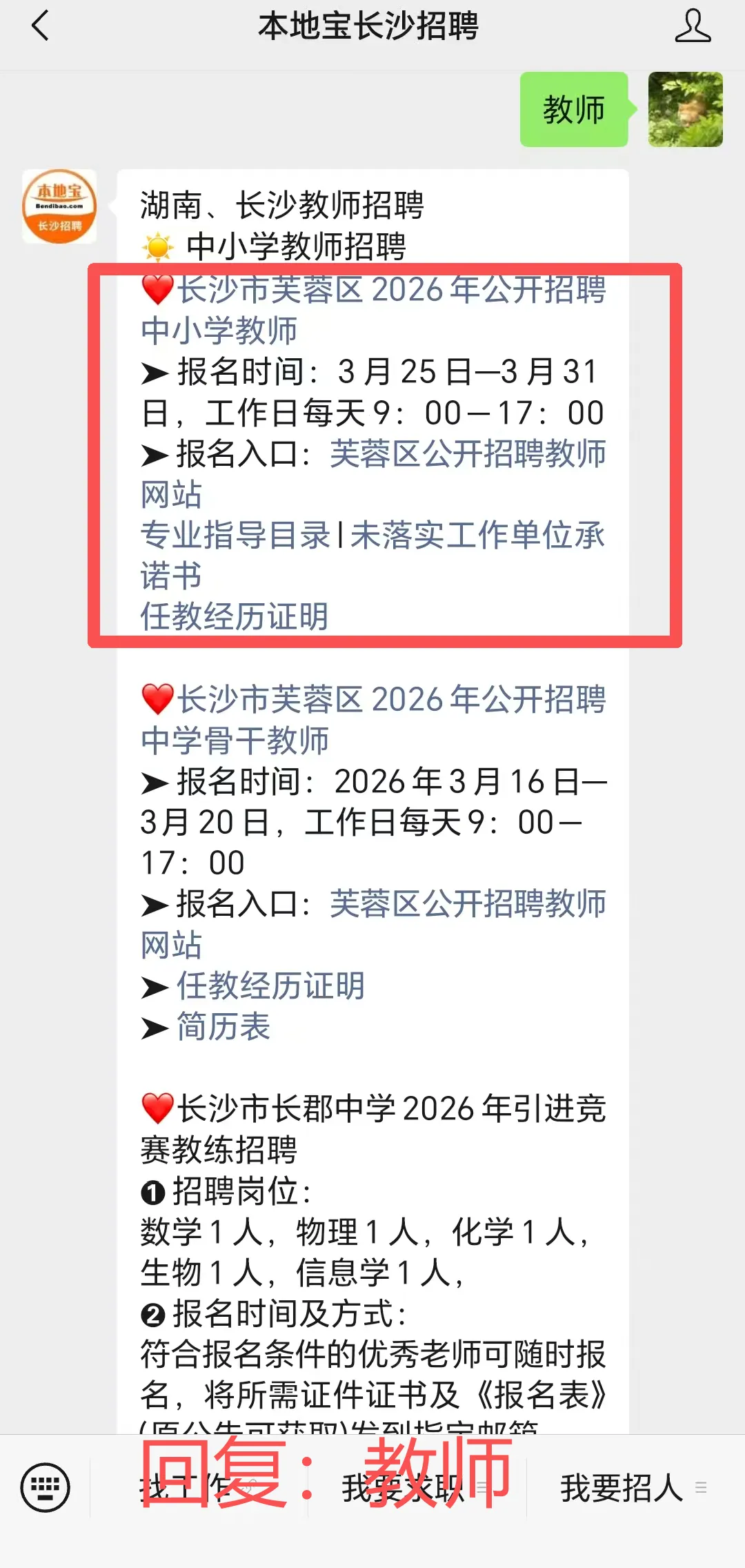 扫描下方二维码关注【本地宝长沙招聘】,关注后对话框回复【教师】可获芙蓉区教师直达报名入口和查看招聘公告,岗位表、报名表、咨询电话等相关信息。
