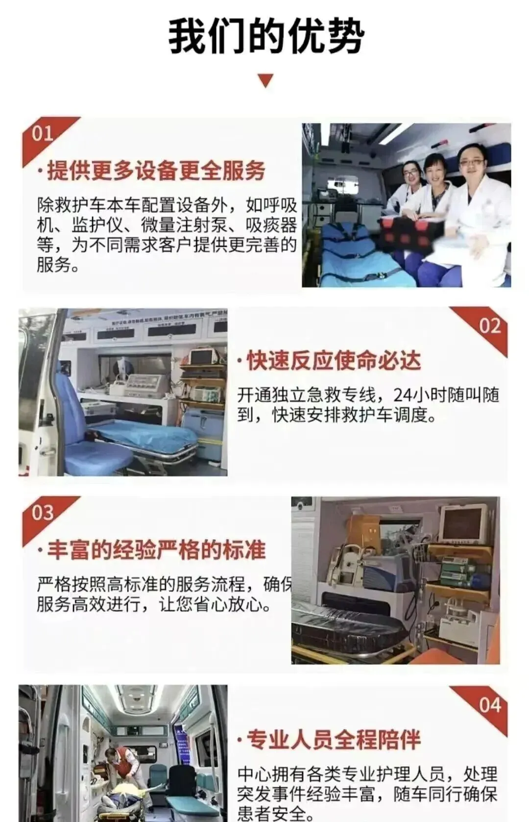 车辆安全:定期检修救护车,确保设备完好率达100%;车内严格消毒,防控交叉感染。医护资质:每车标配持证医生+护士,具备ICU或急诊科经验,可应对突发状况。保险护航:为患者投保百万医疗责任险,签订正规服务协议,法律保障权益。