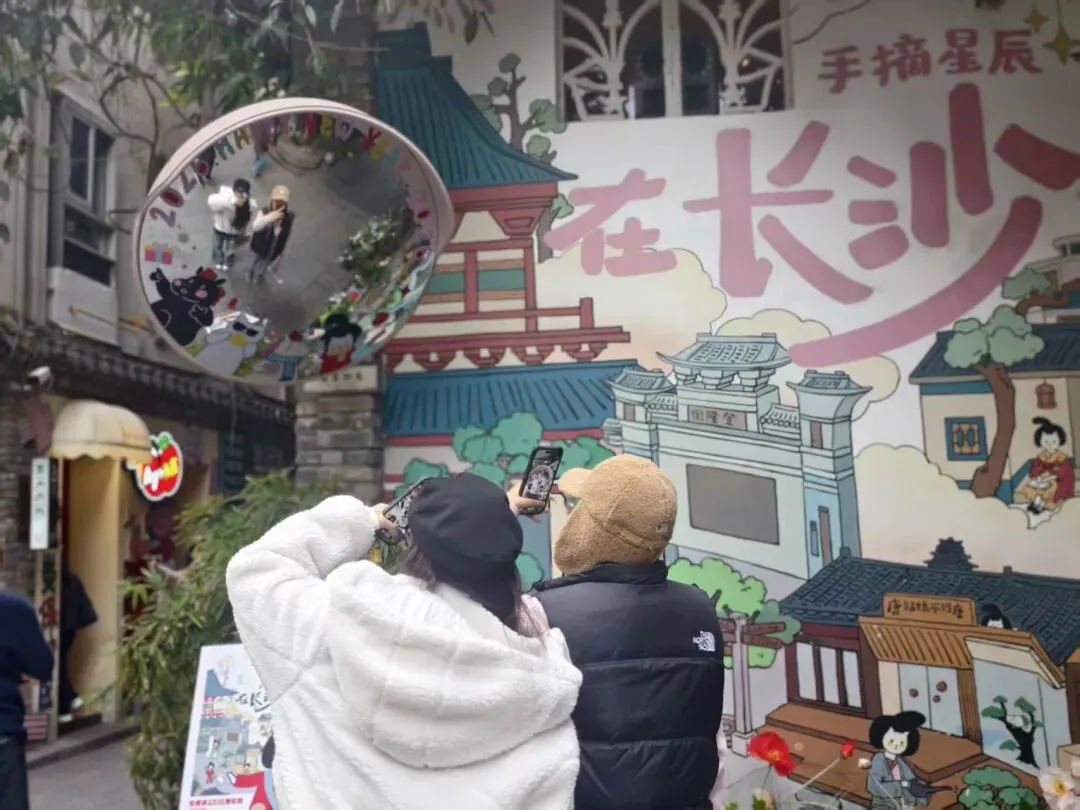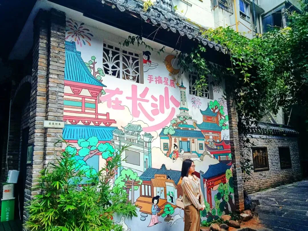 巷子口那面“在长沙,手摘星辰”的墙绘前,举着相机的女孩排着队。
