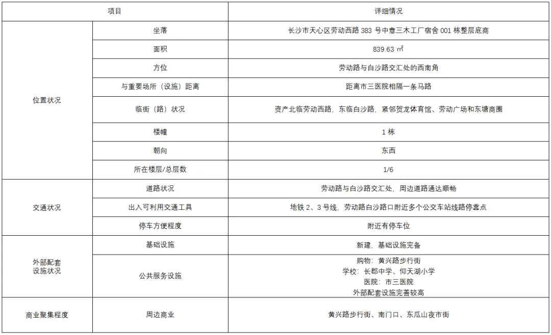 中意三木工厂宿舍001栋整层底商资产位于长沙市天心区劳动西路383号,对外招商面积839.63㎡,产权清晰且为新建的框架结构房屋。资产北临劳动西路,东临白沙路,紧邻贺龙体育馆、劳动广场、和东塘商圈,集优质生活服务、商旅休闲、商务办公于一体,享有便捷的交通资源(有地铁三号线和多条公交线路可达)、优质的教育资源、医疗资源以及文化资源。
