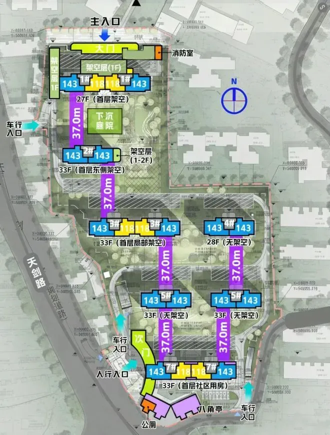 小区体量有限,做不了大园林,好在北侧做了下沉花园,能多一点绿化空间。网传会配会所,但小区规模小,后期能不能稳住运营还得看时间。只有 1 栋首层全架空、2/3 栋局部架空,公共活动空间不算宽裕;再加 37 米楼间距要留消防登高面,地面绿化不会太多。
