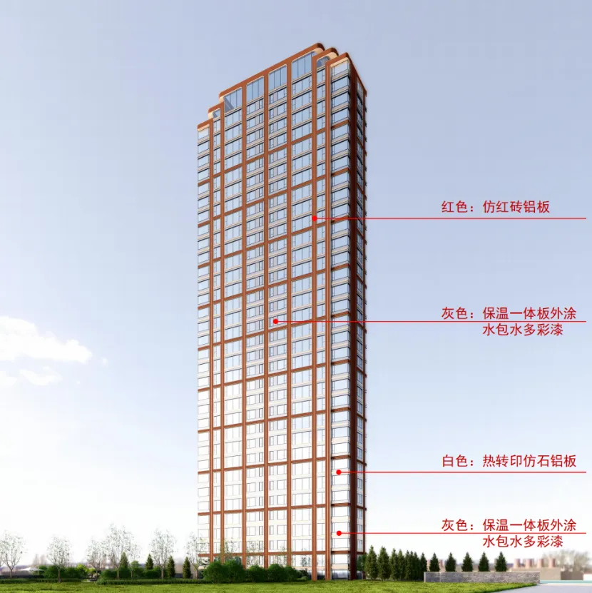 风格定位海派新中式,用料是仿红砖铝板 + 灰色保温一体板 + 白色仿石铝板。