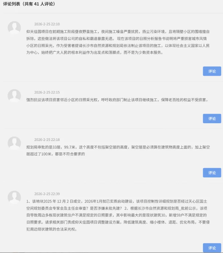 据悉项目近期因为周边居民群诉、未按公司预期进度拿到“工程规划许可证”,群诉的原因在于项目24小时施工扰民及项目建成后将恶化周边100余户居民楼的日照,目前开发商暂未就日照补偿与周边居民达成一致。