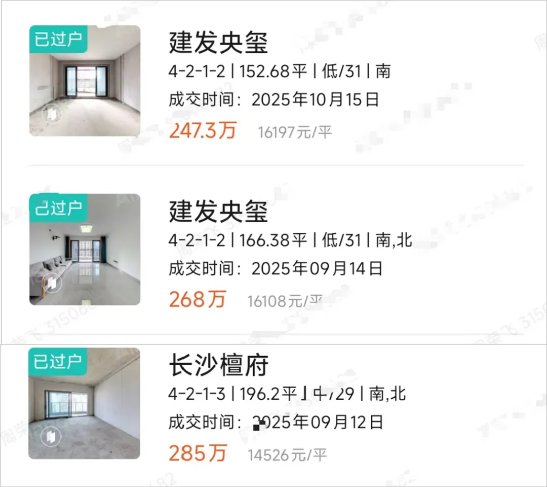 长沙檀府成交价格为1.4-1.5万/㎡,挂牌价格在1.6万/㎡左右,总价250-400万;建发央玺成交价格1.6万/㎡,挂牌价格1.8-1.9万/㎡,总价250-450万区间。