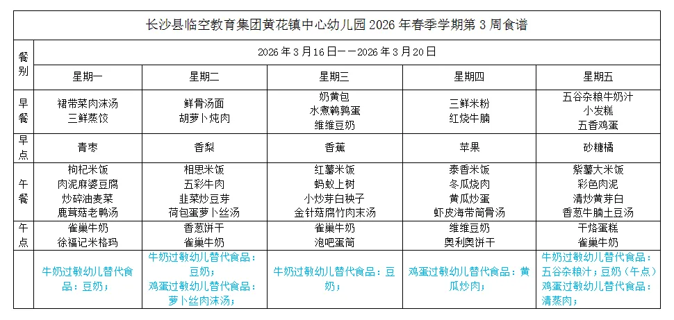 【营养食谱】长沙县临空教育集团黄花镇中心幼儿园第二周营养食谱回顾&下周食谱预告
