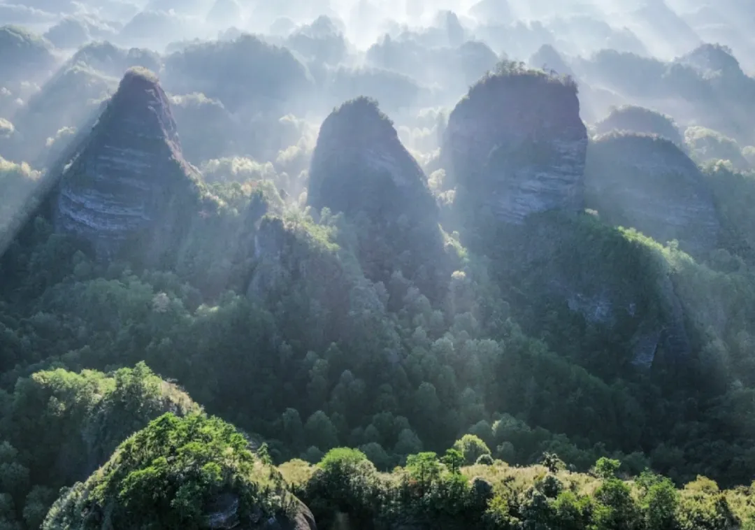 丹霞的红,沿着林子的绿,轻轻晕染开。清晨的雾,从栈道缝里钻出来,像给你留了一点余地。