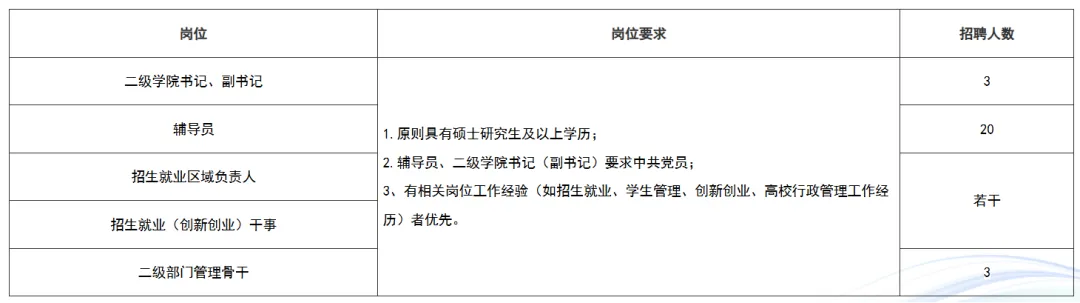 3、辅导员应为中共党员,硕士及以上学位;具有高校辅导员工作经历、有工学/心理学/教育学/思想政治教育等相关专业教育背景,有招生就业工作经历者的同等条件优先。