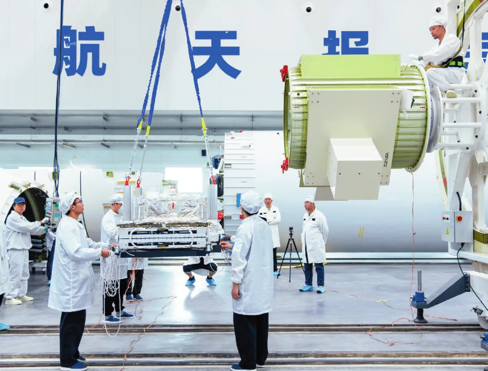由天仪空间研制的神启号 02 星等 6 颗商业卫星在东风商业航天创新试验区发射升空。图为工作人员在进行星箭对接(2025 年 5 月 17 日摄)天仪空间供图