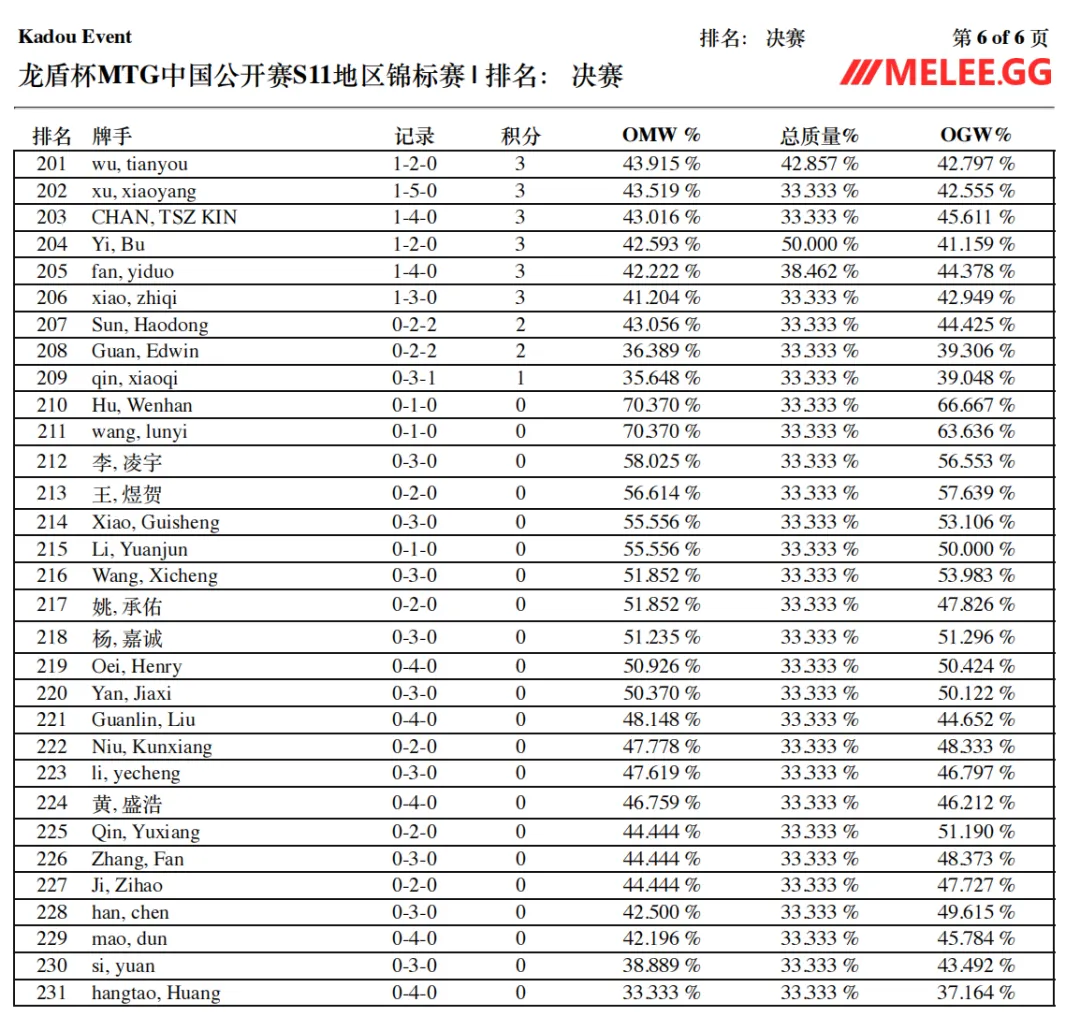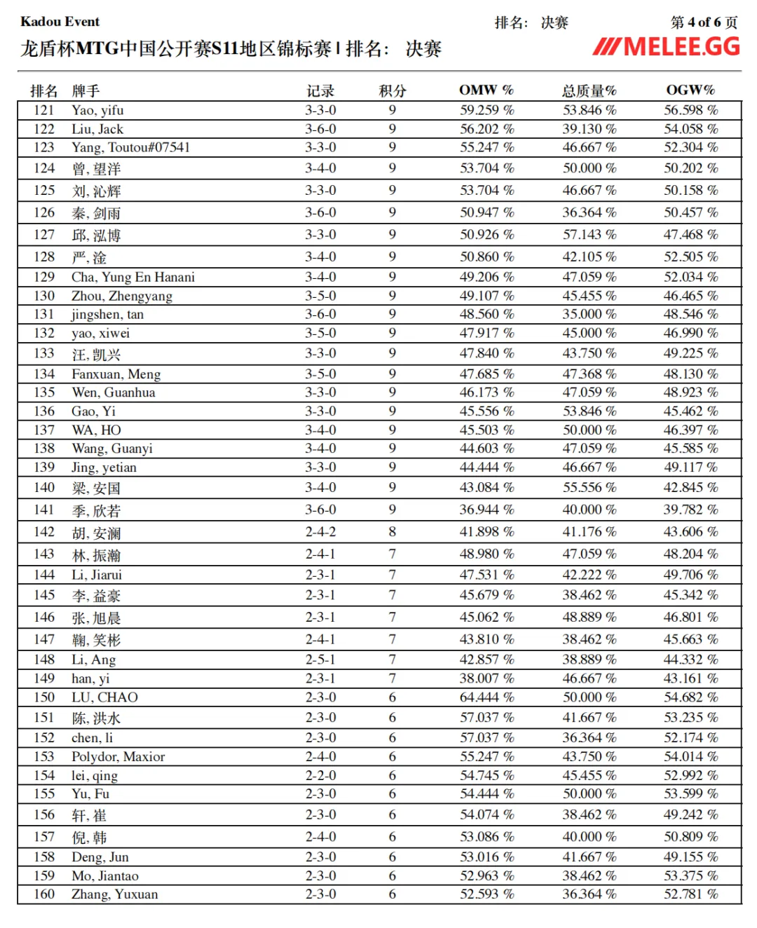 经过周六一天九轮的比赛,龙盾杯万智牌中国公开赛第十一赛季总决赛的八强牌手分别是: