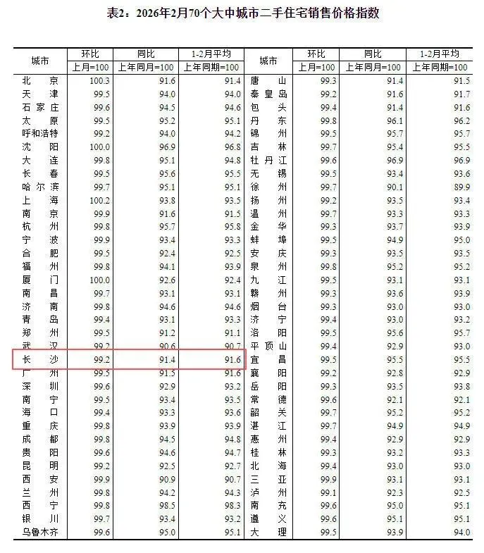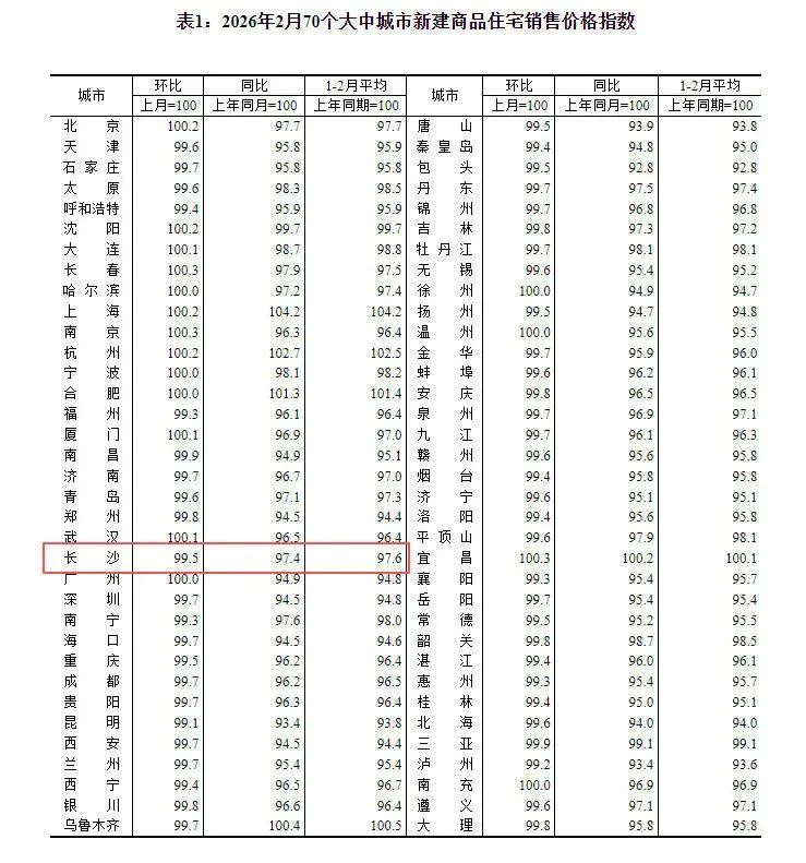 根据国家统计局发布的《2026年2月份70个大中城市商品住宅销售价格变动情况》,长沙2月新房价格环比下降0.5%,同比下降2.6%。