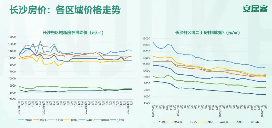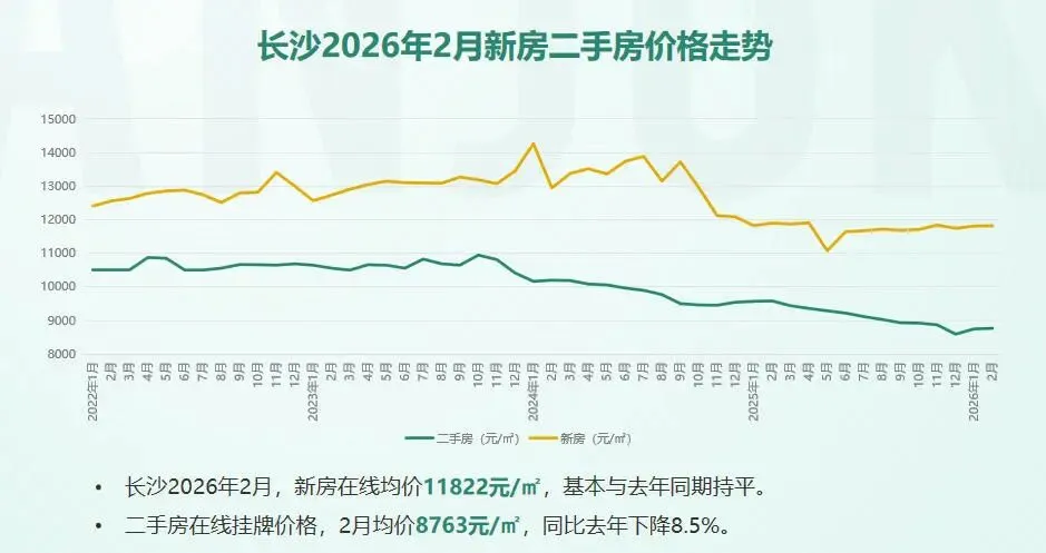 根据安居客新房在线均价数据,长沙2026年2月,新房在线均价11822元/㎡,基本与去年同期持平。