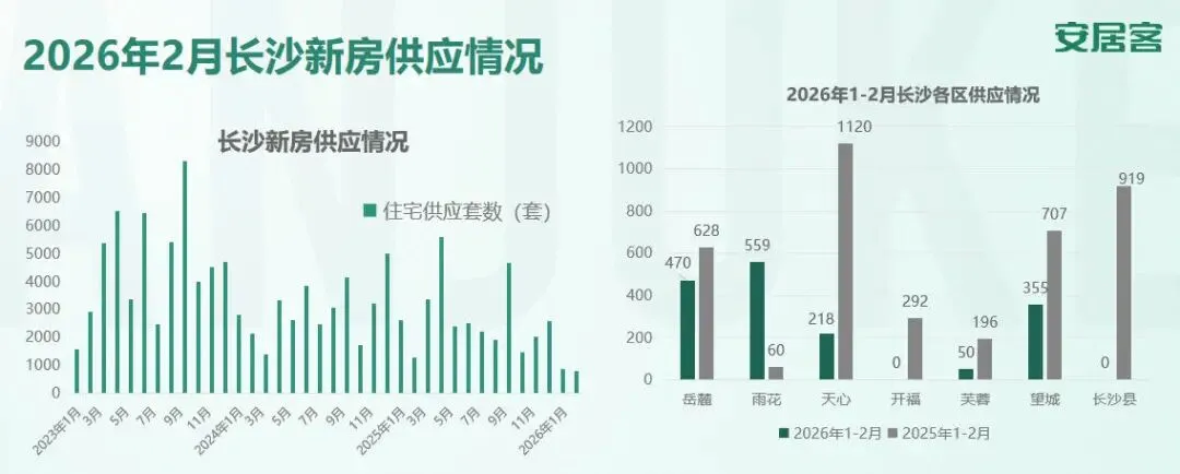 2月,长沙新房住宅供应796套,同比2025年2月(1272套)下降38.4%。综合2026年1-2月的数据,长沙新房住宅供应共1652套,同比2025年1-2月(3922套)下降57.8%2026年1-2月,分区来看,雨花区共有559套住宅入市,其次为岳麓、望城、天心;同比去年,除雨花外,其他片区供应均明显减少。