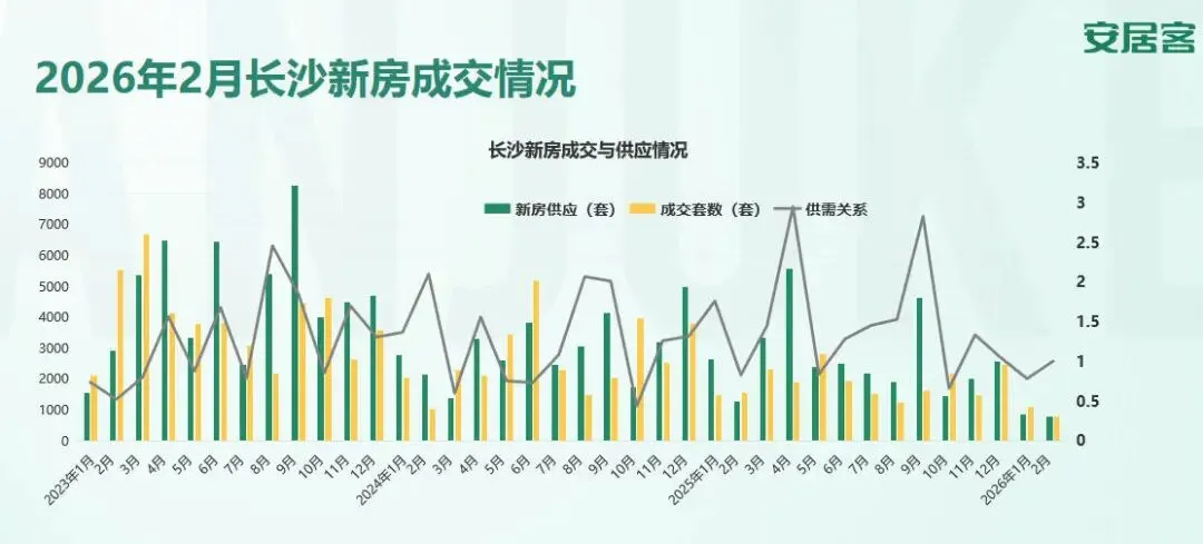 新房成交方面,2026年2月,长沙新房新房成交790套,同比去年2月(1556套)下降49.22%。