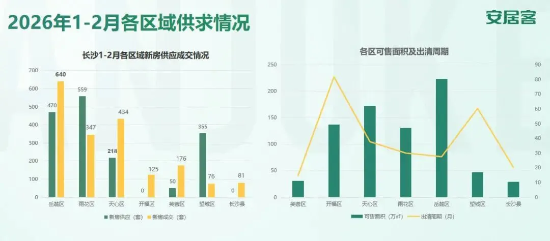 从可售面积来看,岳麓区居首,其后为天心、开福;出清周期来看,芙蓉区、长沙县因供应较少,去化周期相对较短,望城、开福去化压力最大。