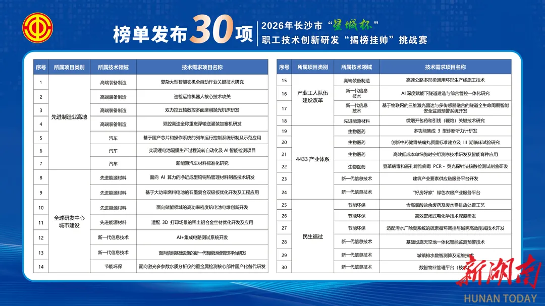 近日,长沙市“星城杯”职工技术创新研发“揭榜挂帅”挑战赛在湖南工匠学院长沙分院启动,现场发布30项产业技术需求榜单,向全社会发出创新攻坚邀约。