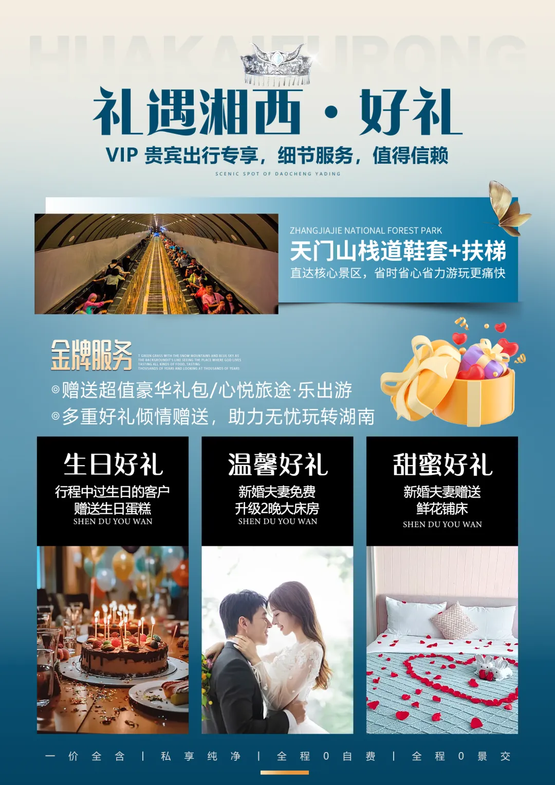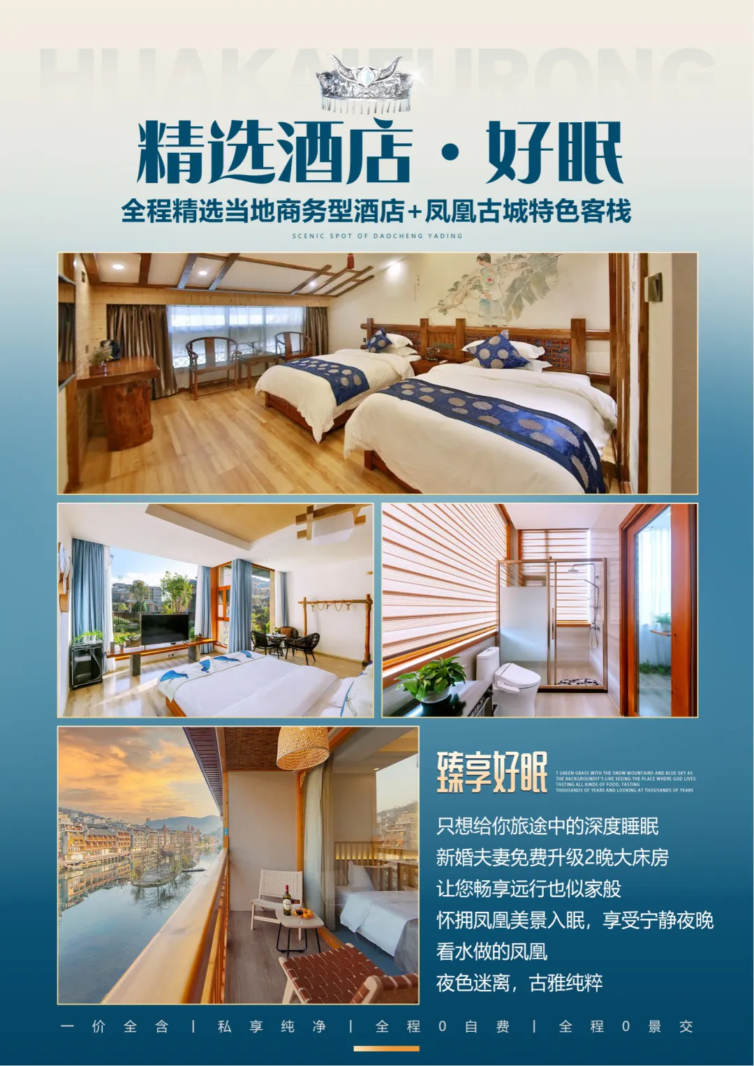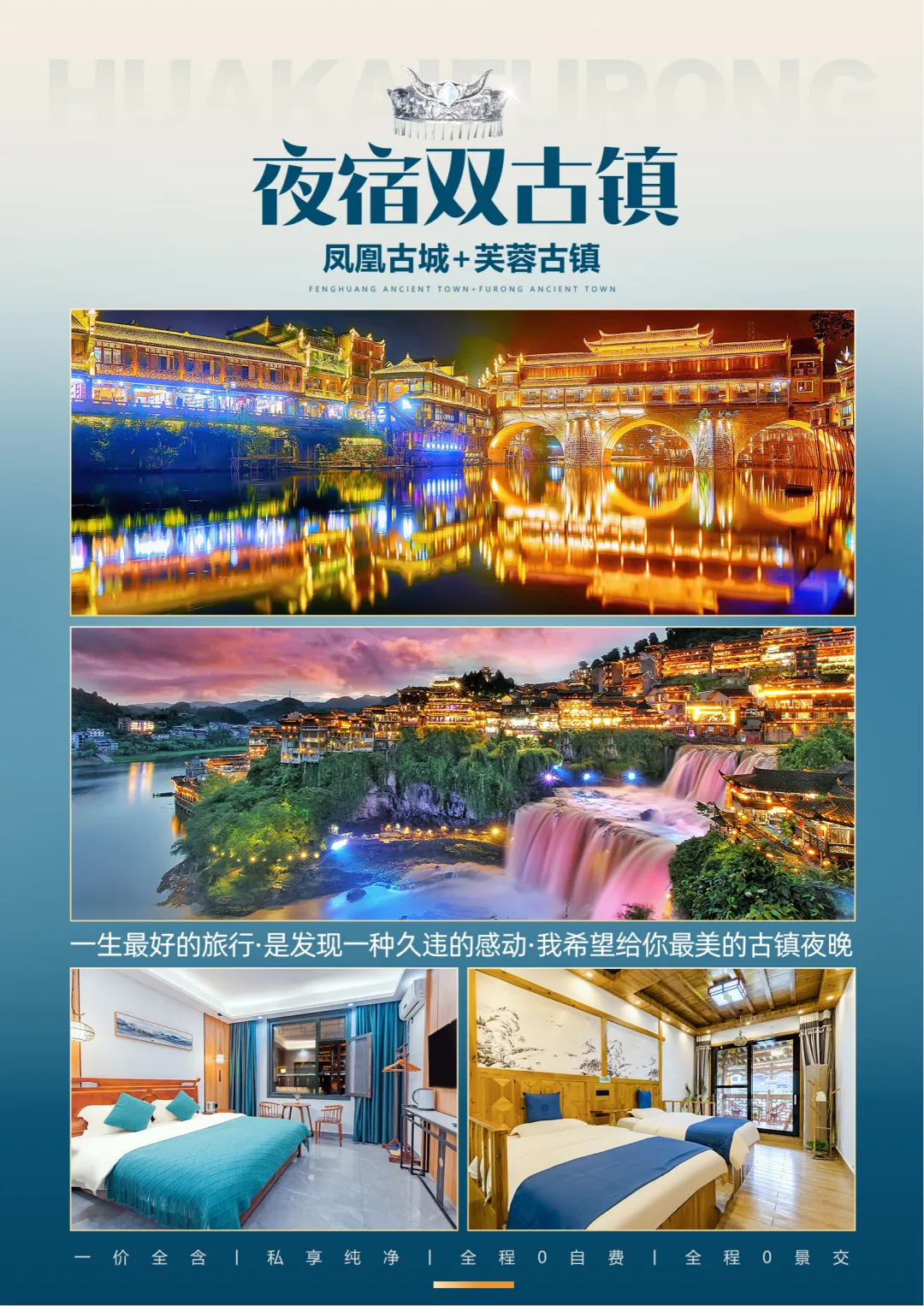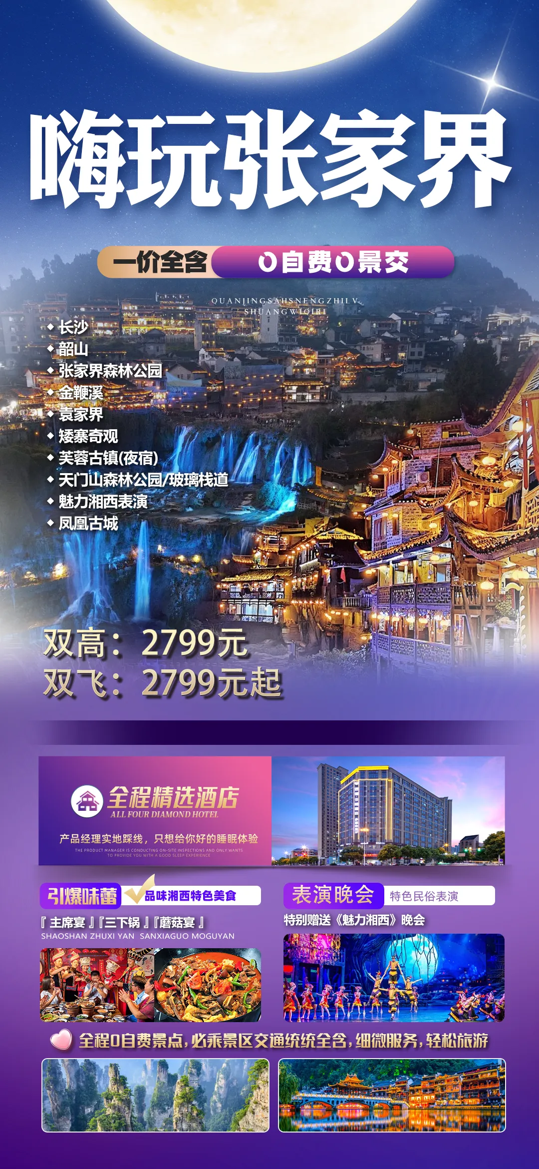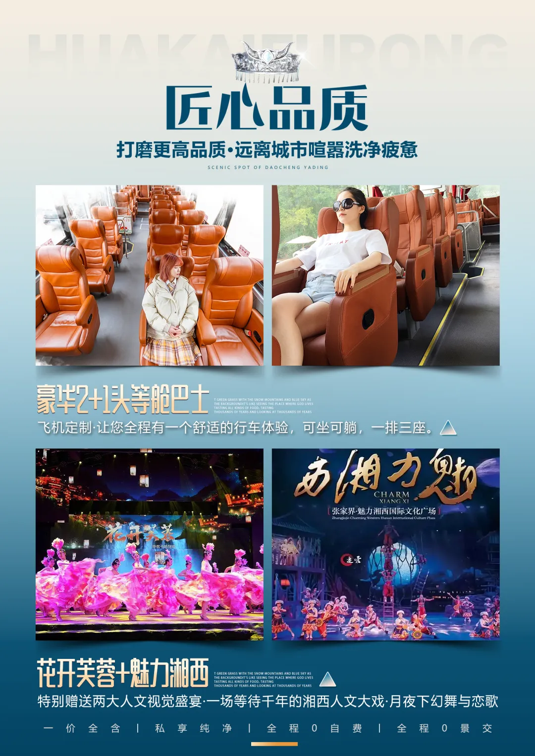 夜间赠送大型原创行浸式实景民族风俗演绎【花开芙蓉—毕兹卡的狂欢】(因景区赠送晚会,如遇堵车、下雨或官方停演及特殊原因不能正常观看无退费请谅解)呈现形式在中国旅游演艺中独一无二。观演是在独有的自然、人文环境中行进与沉浸相结合,室外与室内相呼应。其间你可见证千年前土王内心的强大和刚烈以及土王与楚王立柱为盟的场景。你可欣赏以祈福为目的的“梯玛神歌”、“土家铜铃舞”、“摆手舞”、“茅古斯舞”、“厄巴舞”等;你可听到迷人的“土家恋歌”、“哭嫁歌”。一条酉水长又长,芙蓉镇里好风光。人生难逢真美事,此刻不妨醉一场。