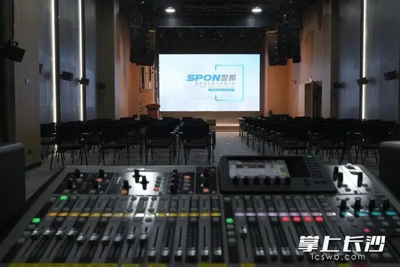 从暗室出来,隔壁是一个截然不同的空间——27声道的全景声光电实验厅。记者走上舞台,头顶的灯光自动亮起,一束光紧随记者移动轨迹缓缓滑动。这是世邦通信自主研发的AI光束灯跟随系统,通过摄像头定位人体,联动灯光控制,演讲者走到哪里,光就跟到哪里,全程无需人工干预。