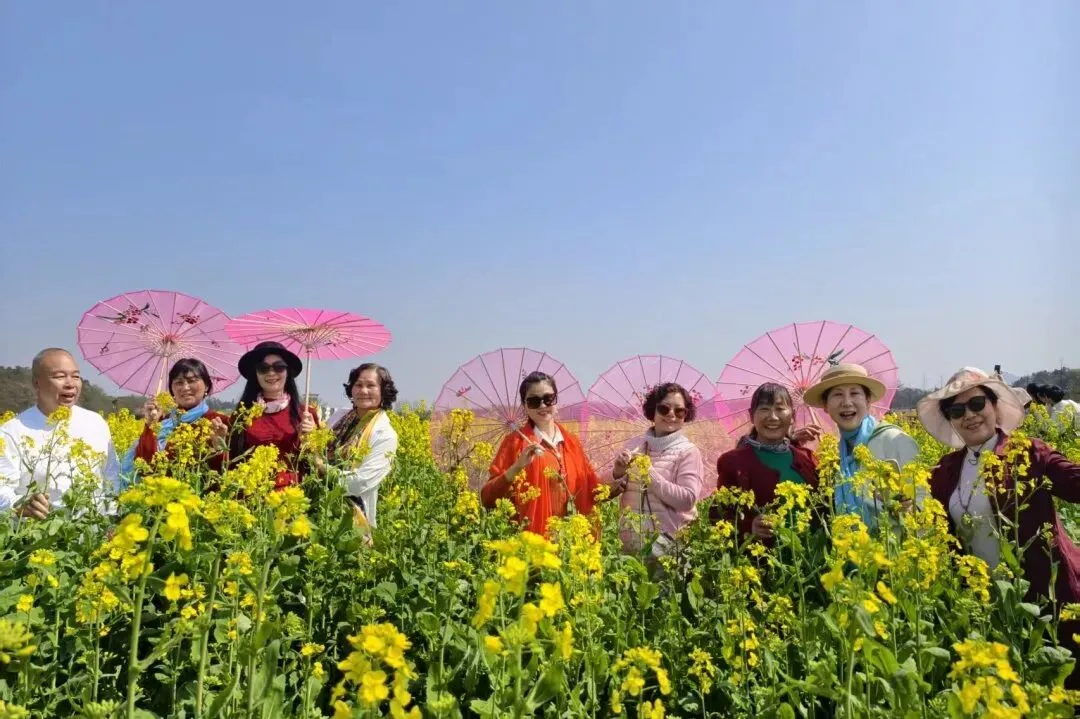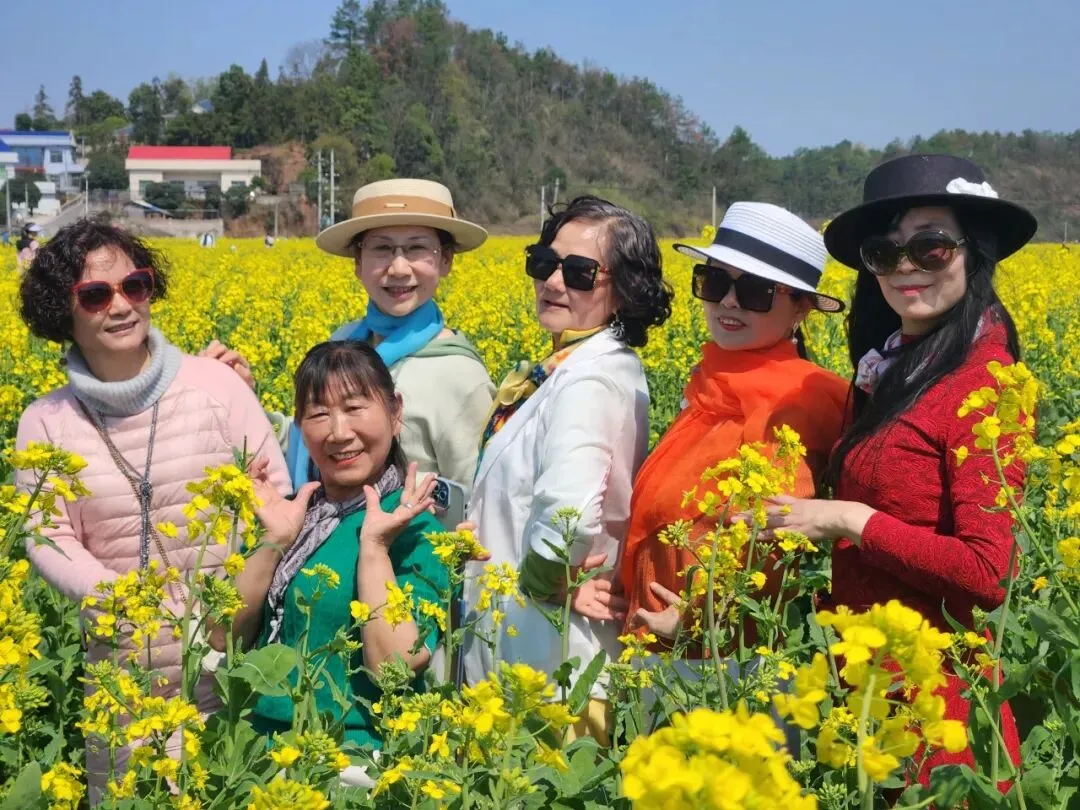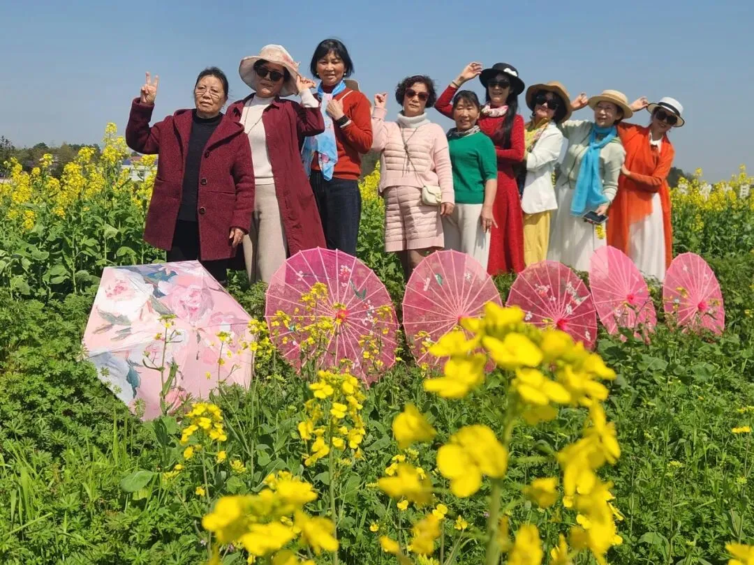 上午时分,当大巴车缓缓驶入长沙县江背镇五福村,车窗外的风景瞬间被金色浸染。“我和我的祖国,一刻也不能分割……”还没等车停稳,不知是谁起了个头,车厢内顿时变成了歌声的海洋。下车后学员们手持丝巾,在及膝的油菜花海中穿梭,金色的花粉沾上衣襟,欢笑声与快门声此起彼伏。“来,姐妹们,看镜头!”“这个角度好!”在金银坝片区,面对一望无际的金色花浪,这群“资深少女”们摆出各种优雅的姿势,每一帧画面都是大片质感 。