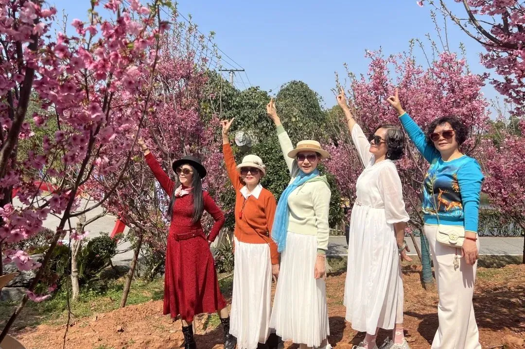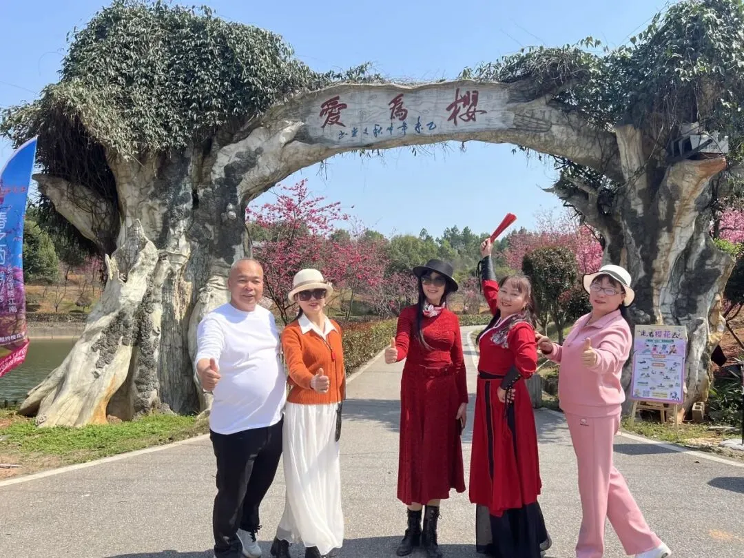 正午时分,踏春队伍转到锦绣江南生态农庄。此时正值农庄红樱文化节,上万株樱花次第绽放,粉色的花瓣雨随风飘落。大家围坐一堂,一边品尝这顿樱花树下的农家盛宴,一边分享着上午拍下的得意照片。