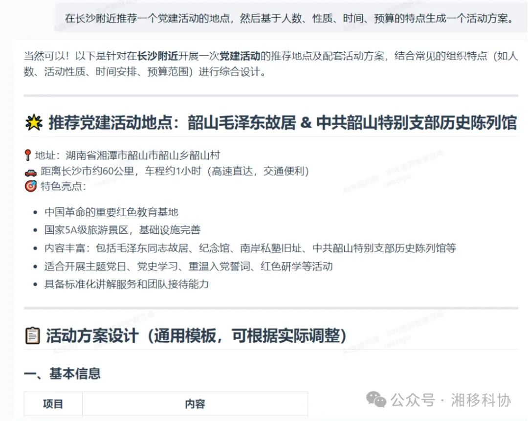 在服务模式创新上,通过九天大模型平台推出 “三维定制化服务”,适配不同的主题及党员的个性化需求,通过场景化案例打造不同的主题党日方案,协助完成党建组织方案、日程提醒等,为支部党建活动推荐活动地点,生成活动方案,并在相关活动活动里标明关于活动场地的开放时间、开放要求等重要注意事项。