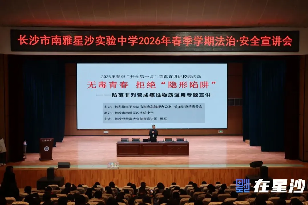 3月12日,长龙街道平安法治办特邀县禁毒协会宣讲团讲师周军,走进长沙市南雅星沙实验中学开展专题讲座,1200余名师生参与。周军老师聚焦青少年防范薄弱点,围绕“防范药物滥用”“新型毒品识别”展开宣讲,以真实案例、触目惊心数据,揭露“跳跳糖”“依托咪酯电子烟”“止咳水”等伪装毒品风险,破除“毒品遥不可及”的认知误区 。活动设置问答互动、毒品仿真模型展示环节,最后全体学生宣誓,营造“教育一个孩子、影响一个家庭、带动整个社会”的良好氛围。