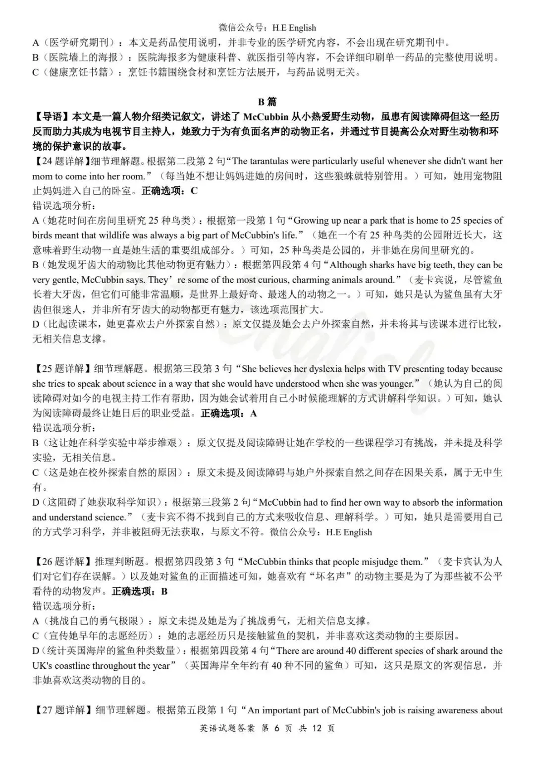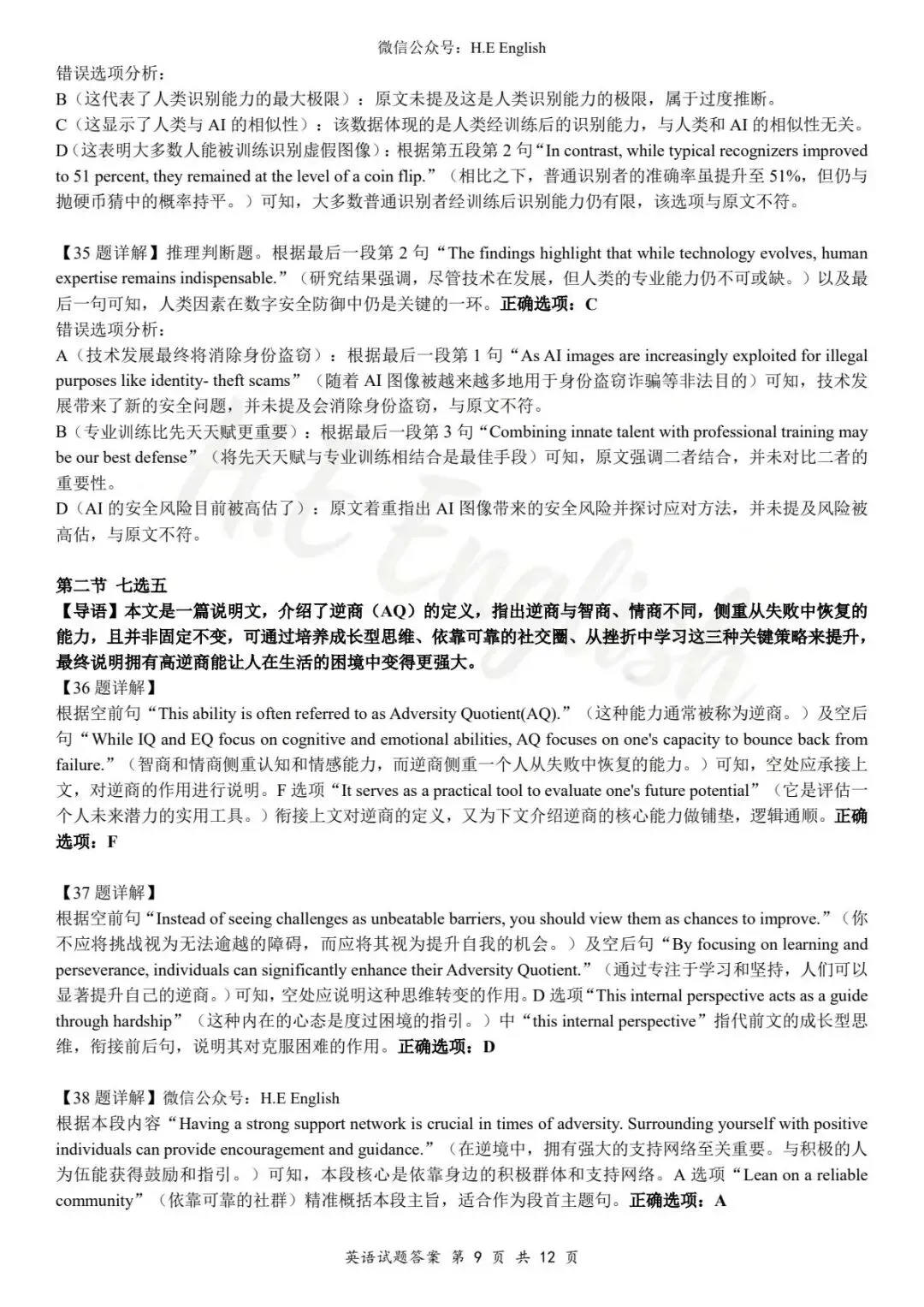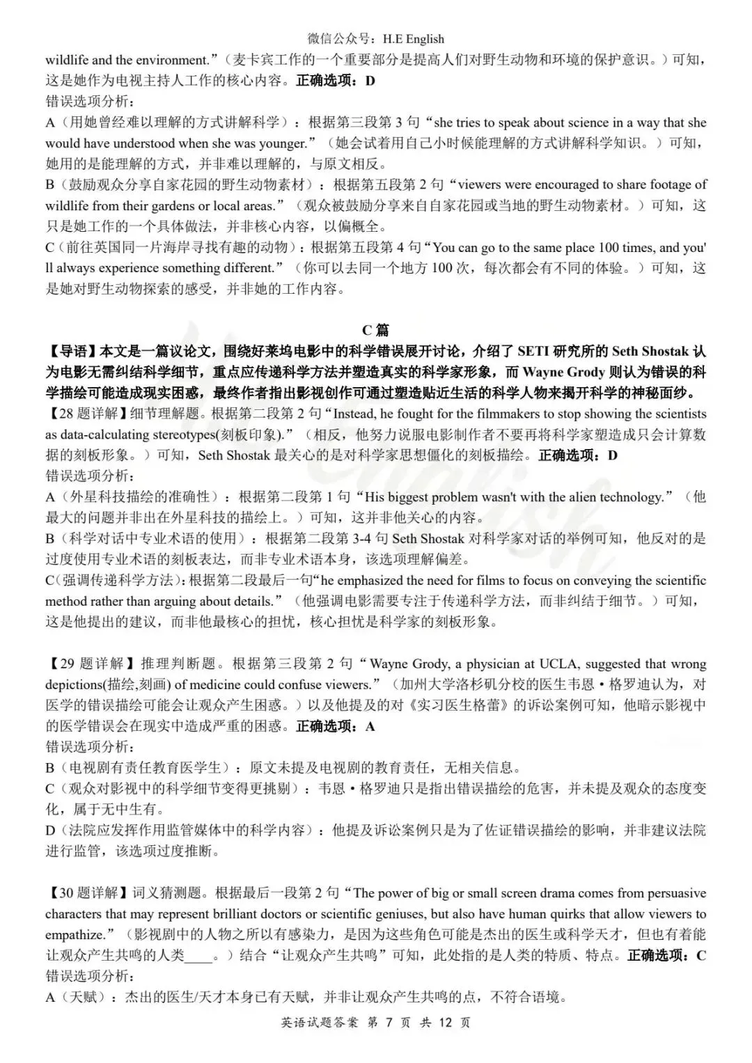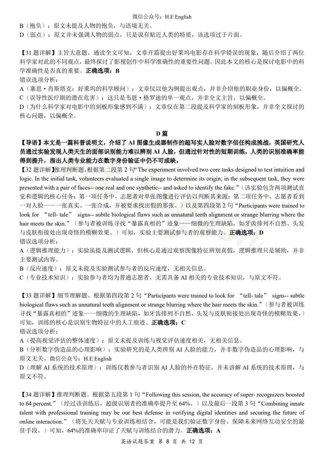 本试卷仅提供重新排版的8页版本(字体小四),并搭配详细的解析(阅读错误选项也有分析)。介意试卷非原版的请忽视。