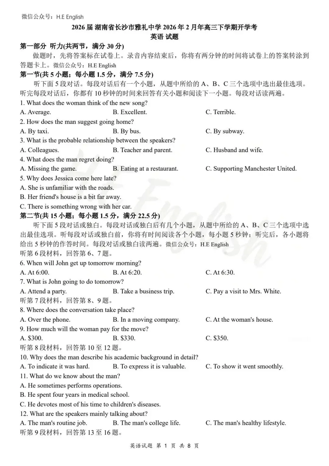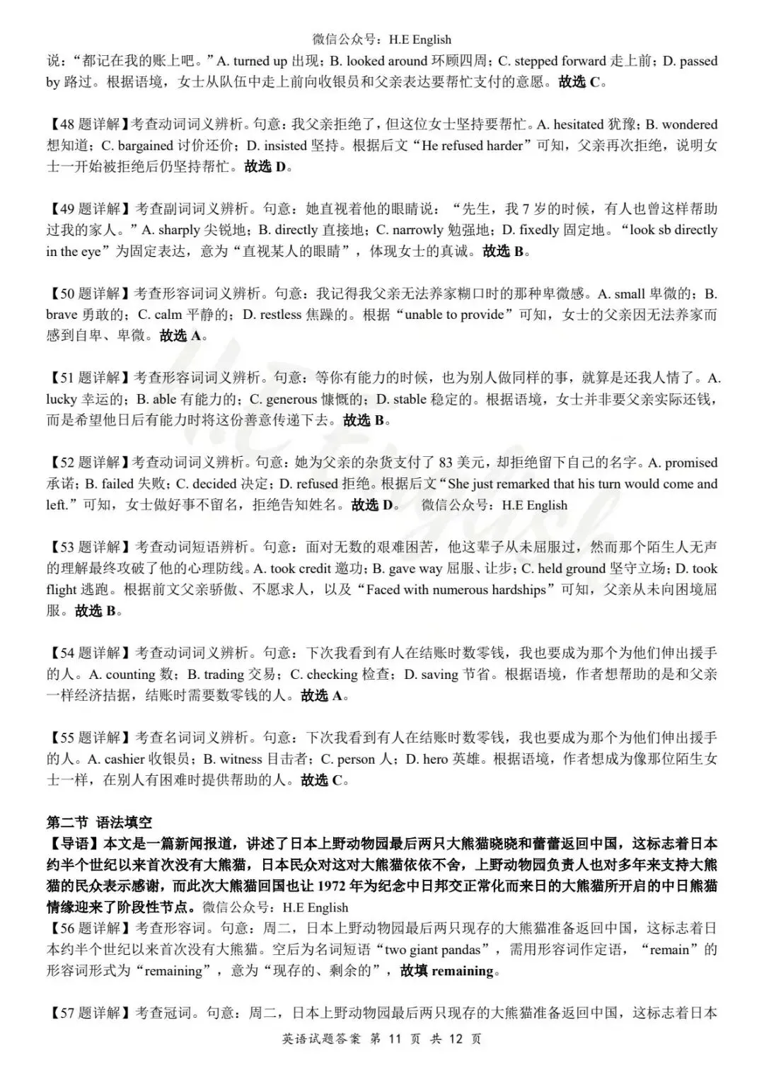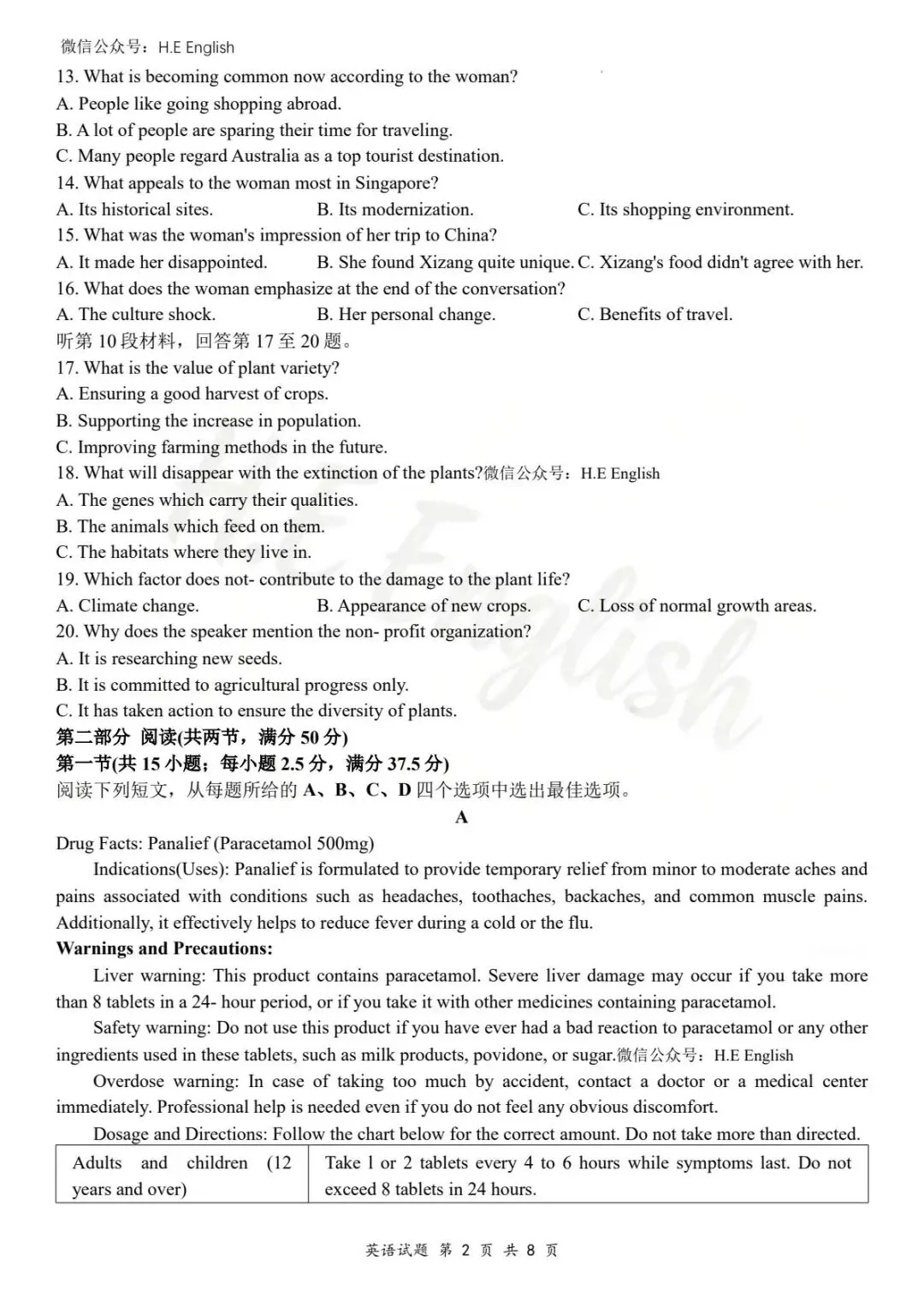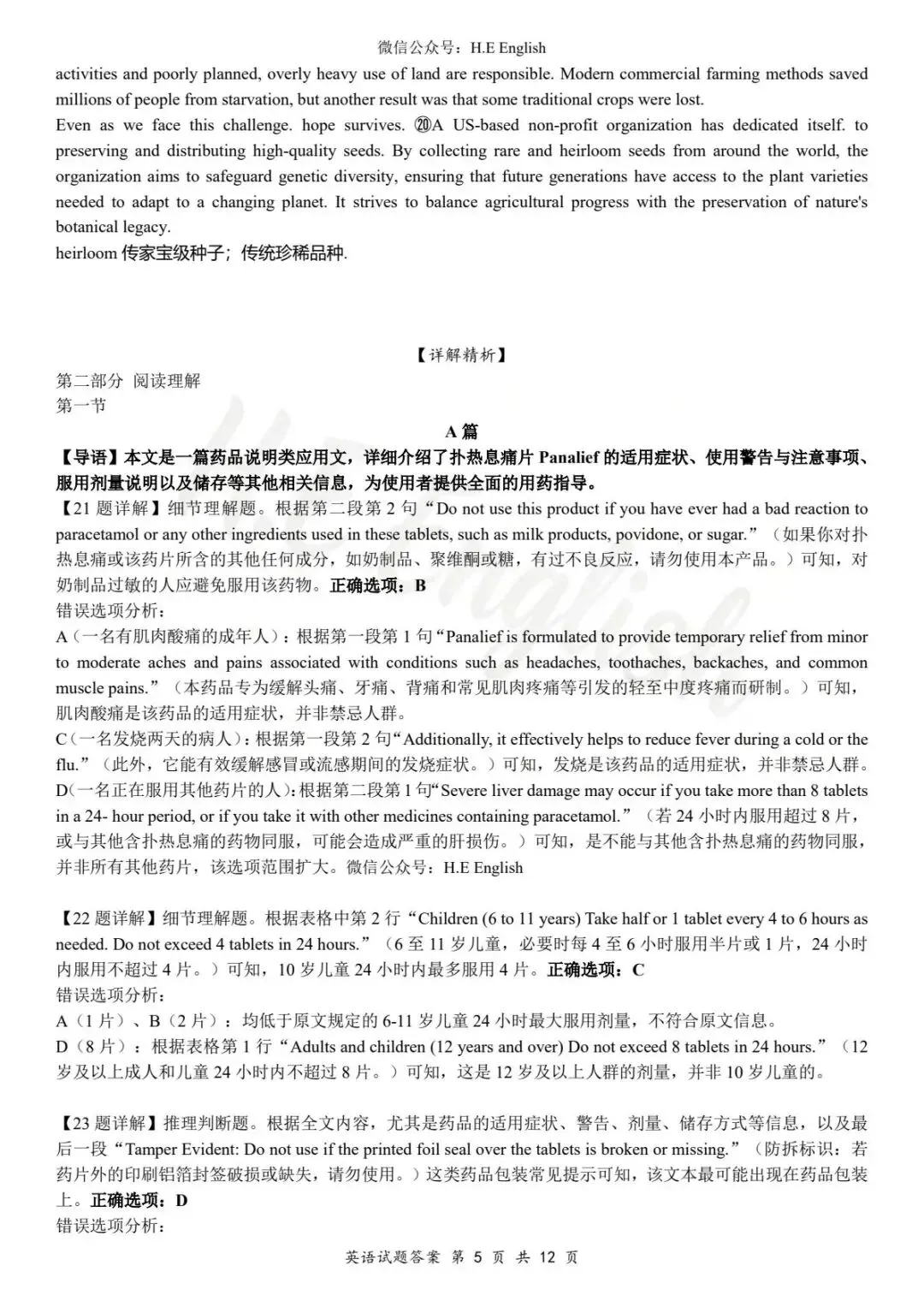 本试卷仅提供重新排版的8页版本(字体小四),并搭配详细的解析(阅读错误选项也有分析)。介意试卷非原版的请忽视。