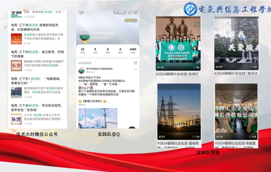 实践活动期间,长沙实践队累计在电光火时、长理学贝等微信公众号发布微推7篇,阅读量4000+;发布新闻稿23篇,其中,在新湖南等外界媒体发布新闻稿3篇,浏览量达90000+;电光火时视频号及b站发布视频4条,获得点赞及爱心2000+;实践队官Q发布动态26条,浏览量8000+。各类网络媒体平台累计总阅读量高达10万余次。