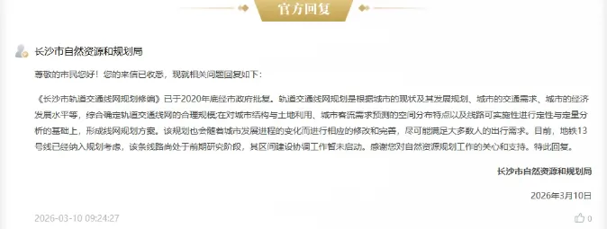 长沙资规局明确回应:地铁13号线已纳入规划考虑,并于2020年底经市政府批复。目前,该方案拟定前期研究阶段。虽然区间建设协调工作暂未启动,但规划已落子。