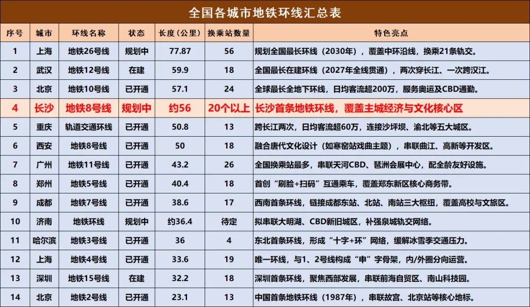 其中,北京、上海都有小环线,还在外围规划更长的。长沙的环线要是排个名,预计能排第4(数据总结自网络,仅供参考)。
