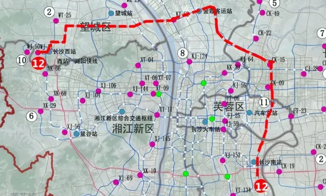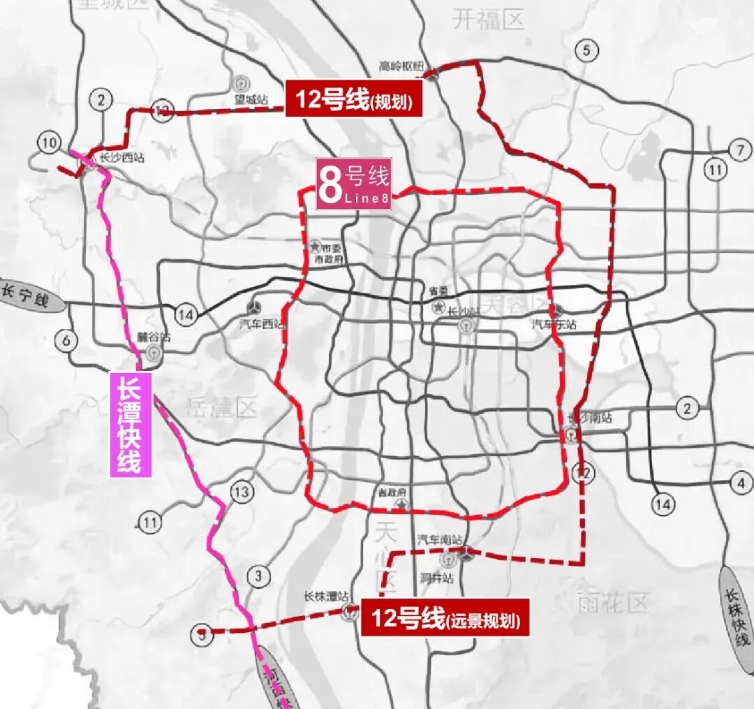 12号线,整体呈霸气的“7”型。建成后将:加强主城区与周边地区的联系,中央枢纽与商业中心。从高铁西城出发,经观音岩、月亮岛,跨湘江,入开福北,超高岭、湘龙、星沙、泉塘,直达高铁南站。