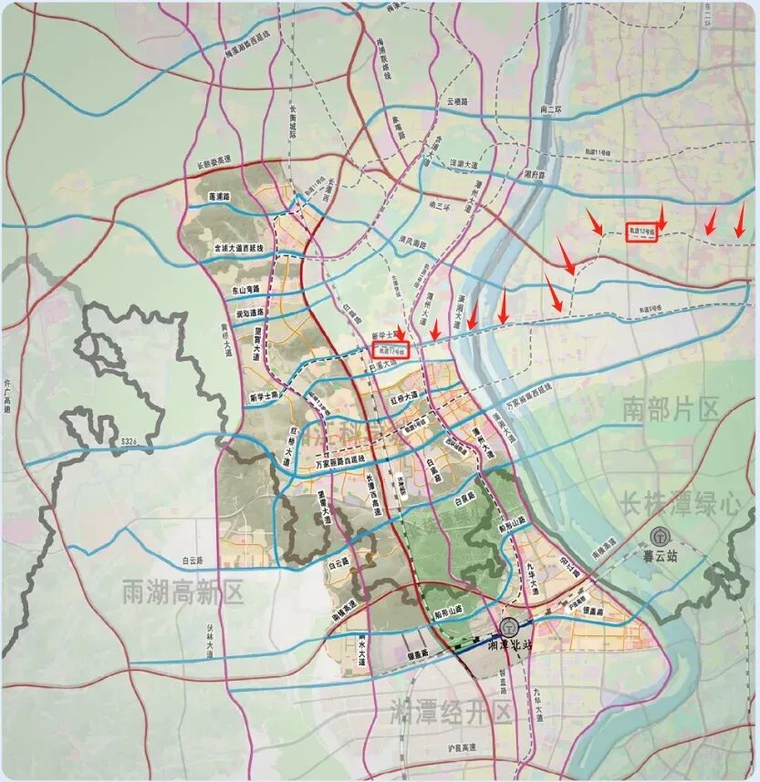 从规划图看,它沿红旗路南下,穿越红星大市场,走时代阳光大道,经过汽车南站,在黑石铺跨江,最后接入大王山南片区(湘江科学城)。