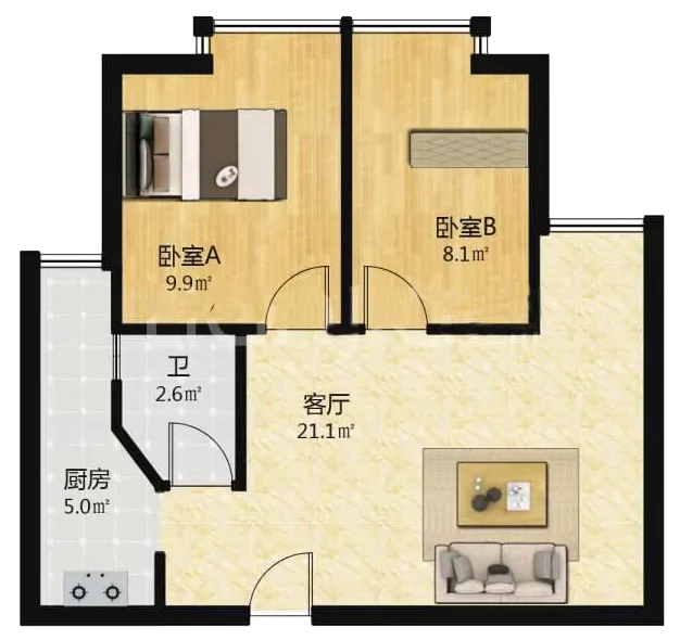 建面约65㎡,实得两室一厅一厨一卫,全明户型,南北通透。