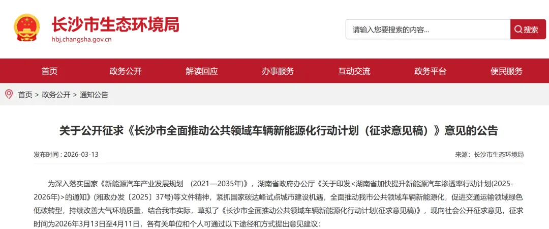 3月13日,长沙市生态环境局发布关于公开征求《长沙市全面推动公共领域车辆新能源化行动计划(征求意见稿)》意见的公告。其中提到: