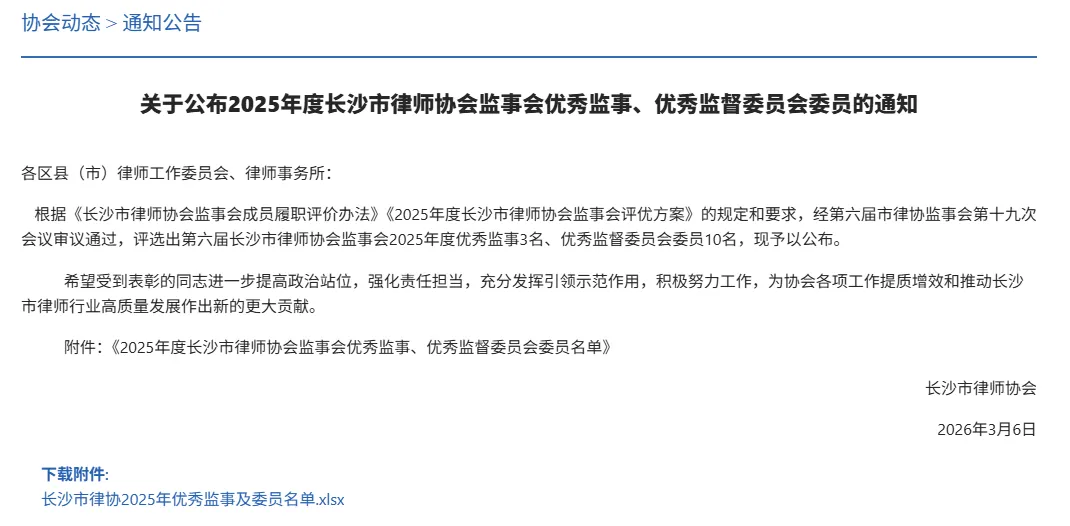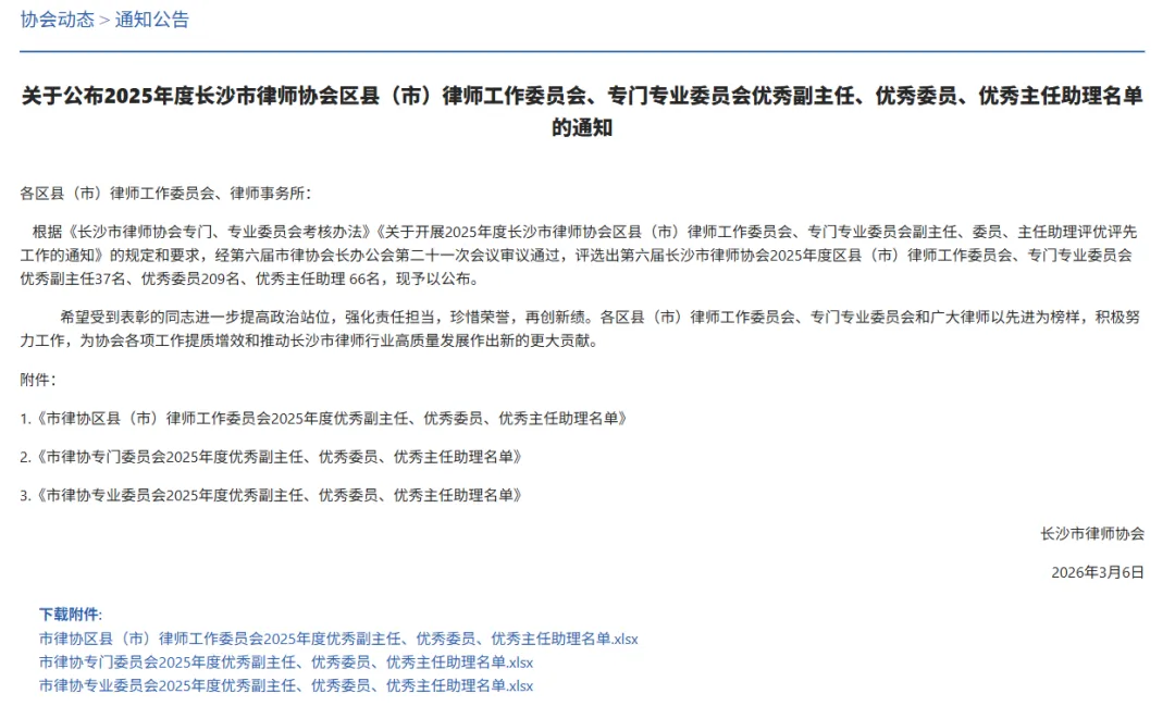 此外,范旦雯律师荣获长沙市律师协会监事会2025年度“优秀监事”;黄春香律师荣获长沙市律师协会公益委2025年度“优秀委员”;奉中华律师荣获长沙市律师协会民专委2025年度“优秀委员”;席月霞律师荣获长沙市律师协会婚家委2025年度“优秀委员”;董盛峰律师荣获长沙市律师协会人保委2025年度“优秀委员”;鲁仁智律师荣获长沙市律师协会财税委2025年度“优秀委员”;熊祖瑞律师荣获长沙市律师协会建房委2025年度“优秀委员”;唐正平律师荣获长沙市律师协会执资委2025年度“优秀委员”;李娟律师荣获长沙市律师协会涉外委2025年度“优秀主任助理”;何之以律师荣获长沙市律师协会侵权委2025年度“优秀主任助理”;刘柏文律师荣获长沙市律师协会网信委2025年度“优秀主任助理”。
