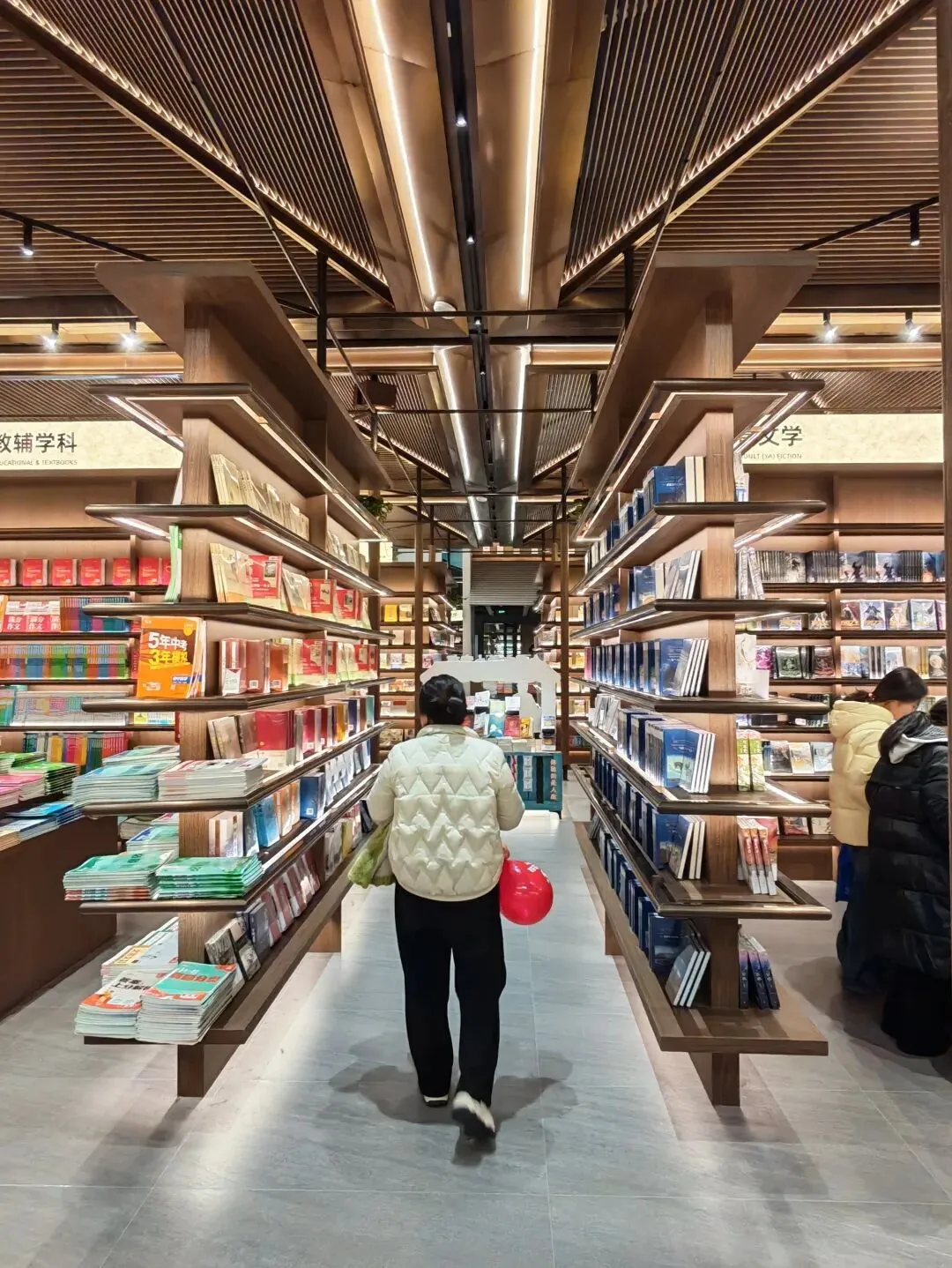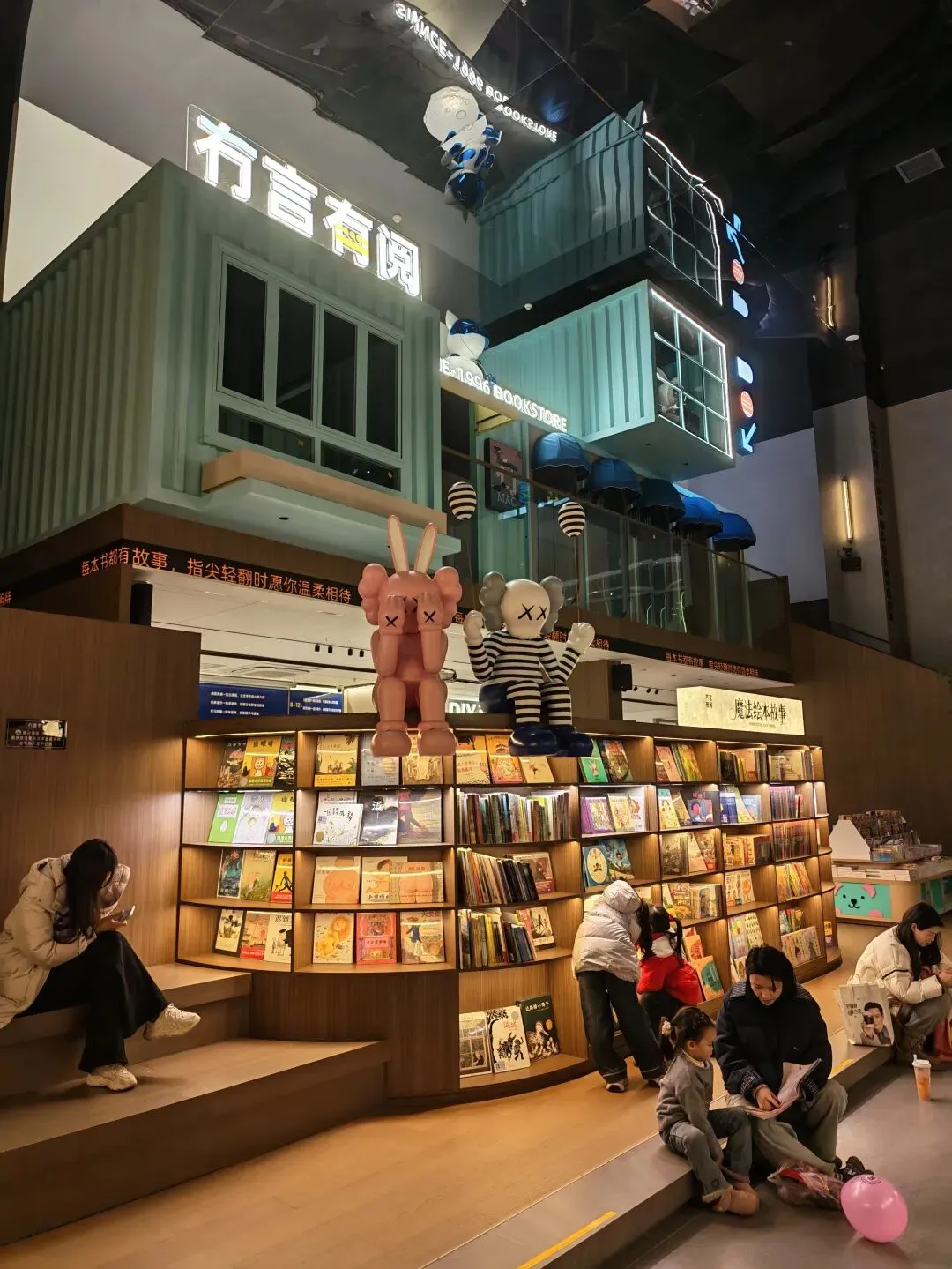 走进书店,仿佛闯入一个国风与童趣感交织的奇妙世界。巨大的古建装饰、随处可见的潮玩公仔(打卡拍照超出片!),专门的儿童绘本区能让小家伙迅速安静下来。看着孩子在书香与雨声中专注翻书的样子,就是最治愈的雨天画面。