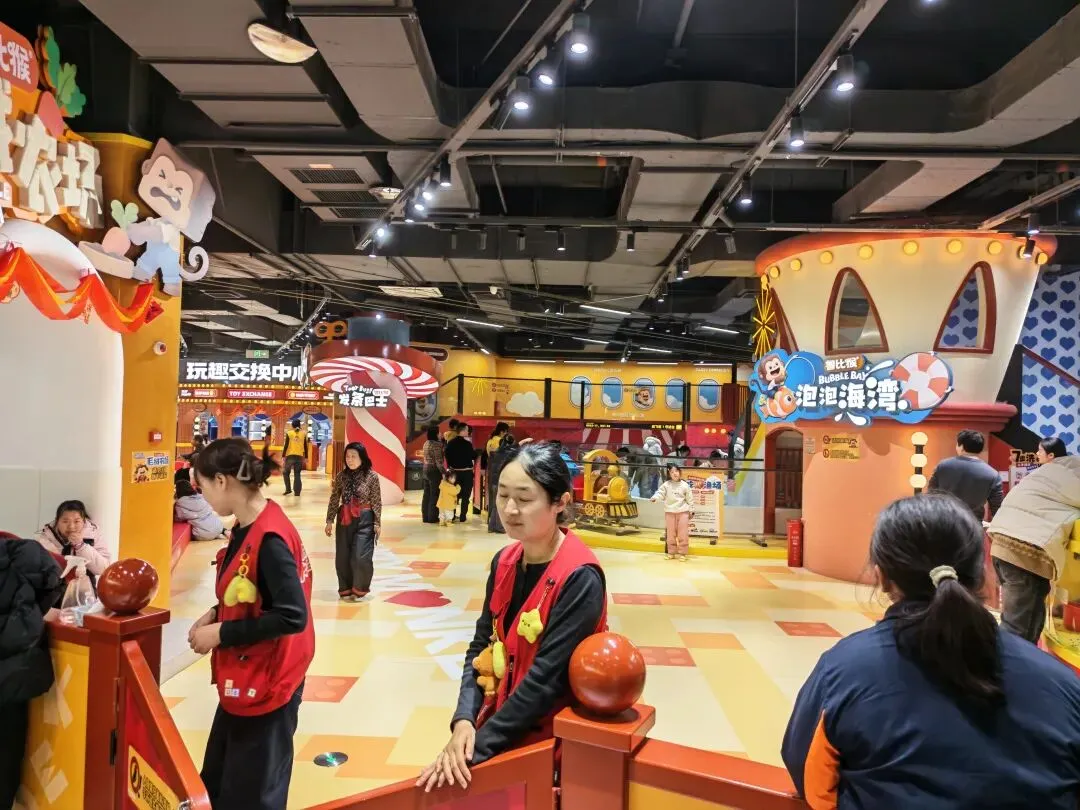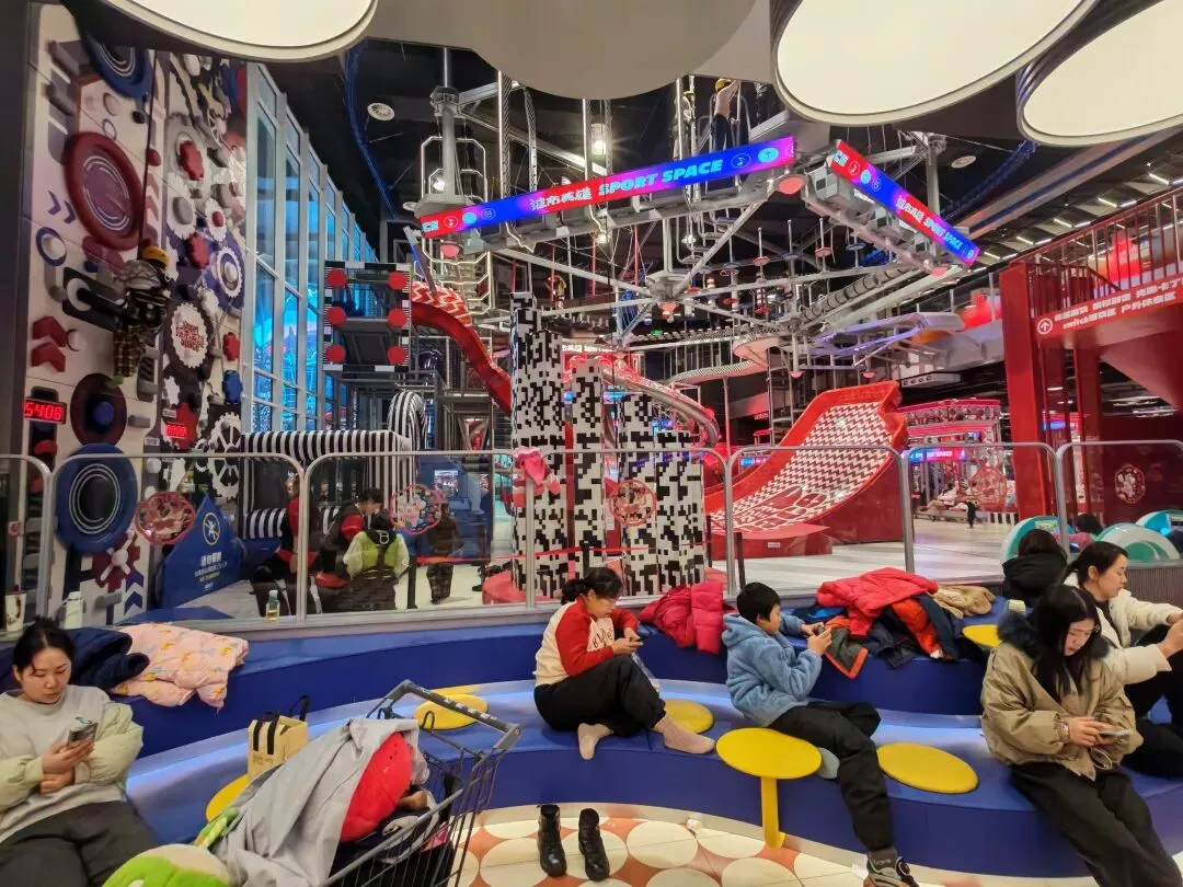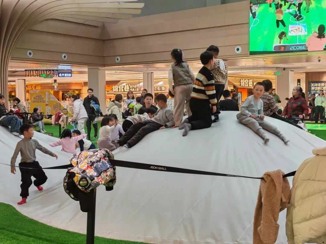 商场宽阔的中庭设置了免费开放的软体游乐设施。仿真草坪、柔软的攀爬坡,让小朋友们可以安全地奔跑、攀爬、结交新朋友。家长只需坐在周边长椅上,就能实现“放手式盯娃”,轻松又安心。