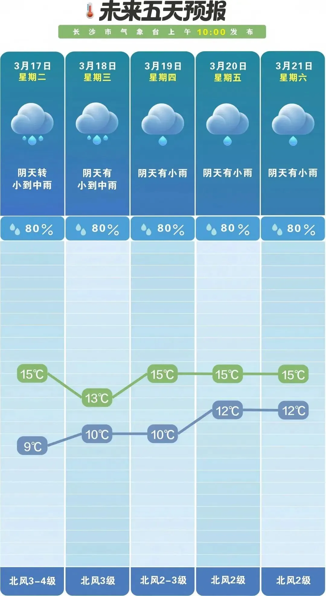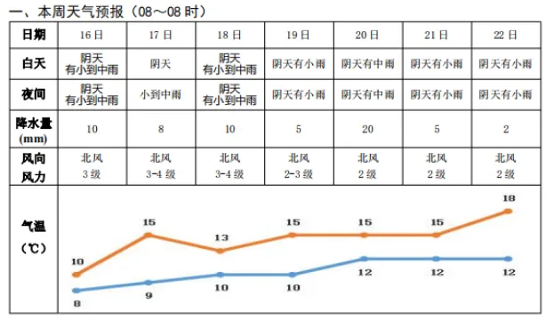 17日晚到18日白天,阴天有小到中雨,北风3-4级,10~13℃;