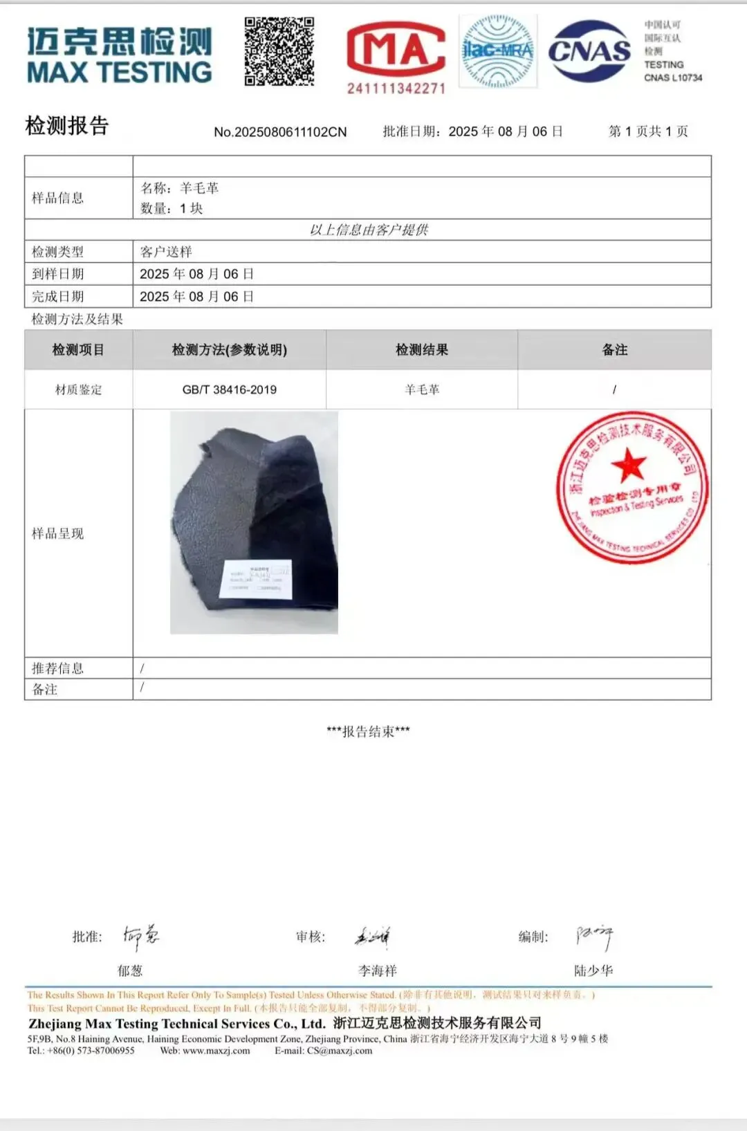△商家提供的检测报告,检测结果为“羊毛革” 受访者供图