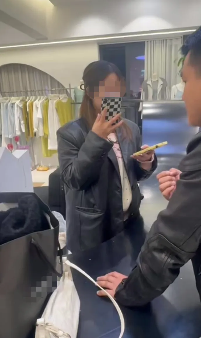 △3月15日晚,女装店老板通过店长的手机与消费者沟通协商皮衣的售后问题。记者见证双方协商过程,老板拿不出有厂家信息的吊牌