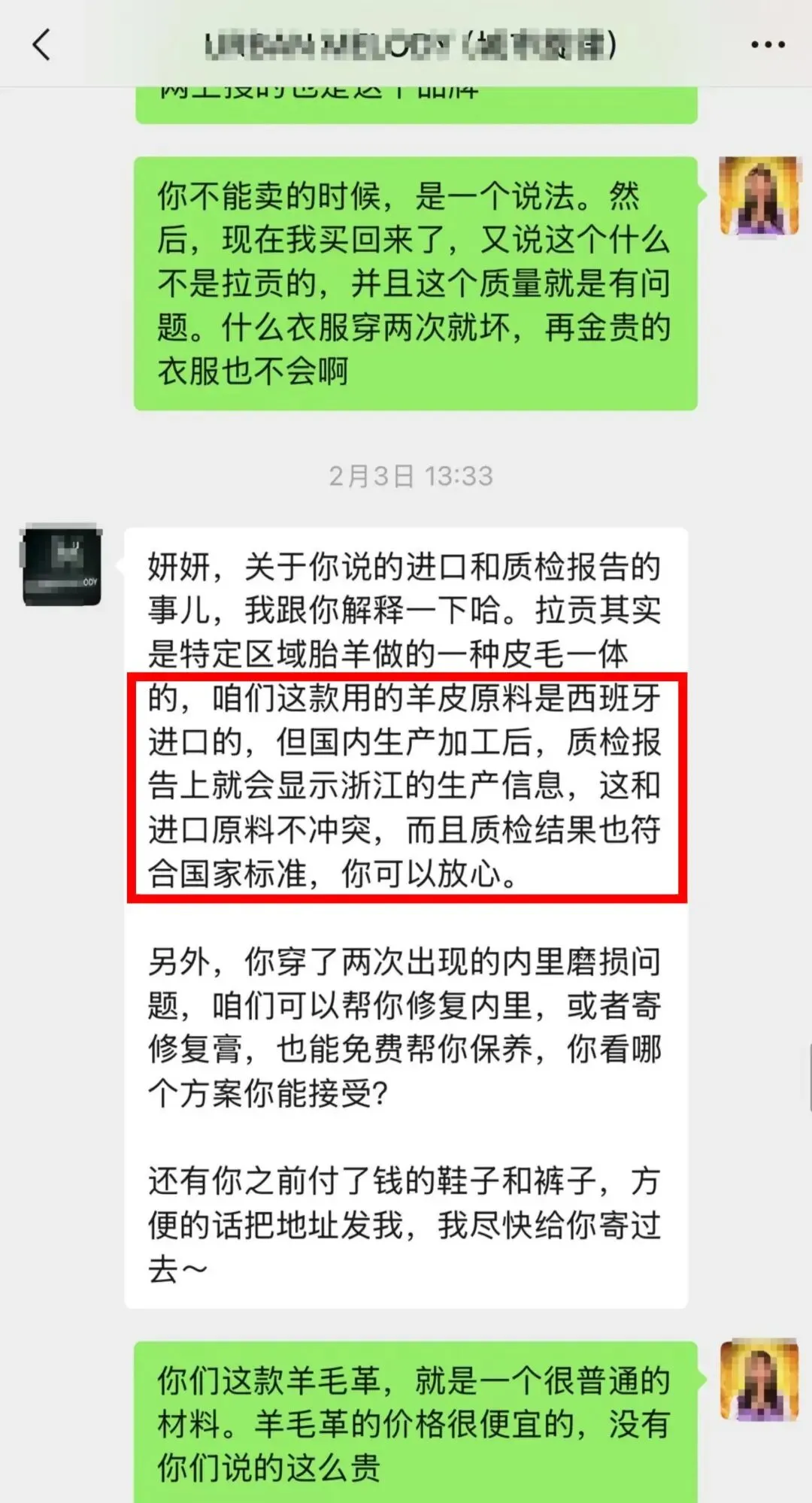 店老板回应称自己在销售过程中从未承诺过该皮草系“西班牙进口拉贡”,并向记者科普了所谓“拉贡”只是一个皮毛一体的称呼。但冷女士很快便拿出了证据,该店客服在与冷女士的聊天记录中提到该皮草的原材料是“西班牙进口”。老板停顿几秒后回复道:有这个东西就去送检,为什么干扰我正常营业?