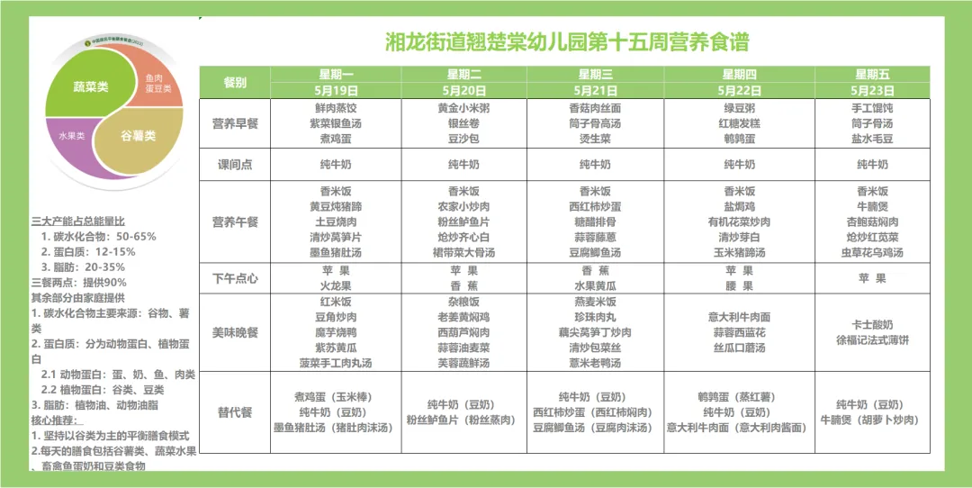 翘楚棠幼儿园根据幼儿体格生长发育特点及中国学龄前儿童膳食指南制订食谱。每日膳食提供的食品包括五大类:粮食类、蔬菜水果类、鱼肉禽蛋类、豆制品奶制品类、油脂类等,且依据科学的幼儿食物摄入量及比例制定带量食谱,以保证食物摄取的种类平均每天12种或是每周达到25种以上。每一个环节都强调安全与卫生,从供货商的选择、原料与食材的采购、食品的验收、食品的保存、食品的留样、餐具的使用、厨房器械的选择等每一个环节都对安全与卫生严格把关,以保证孩子吃到的每一样食品都是放心食品。