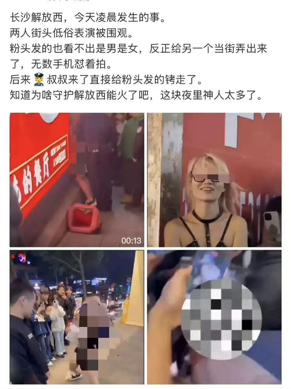 3月15日这天凌晨,长沙解放西五一广场这条步行街上发生了一个大瓜。女子一头黄发,先是当街热舞,动作不可描述般地不可入目,引得周围人注意,等吸引够了目光,时机恰到好处,整条街的人都注目观看她到底要干什么的时候,她就开始了惊人的表演……一刹那,所有人从震惊中缓和过来,然后立刻掏出手机,激动地拍下了这一幕。这架势,宛如明星的记者招待会一样,只不过话筒变成了手机。收音变成了录像。几分钟过后,扑克打完了,当事人还在炫耀着什么,站在墙边像是网红一样接受吃瓜群众的采访。但很快,帽子叔叔们来了,把她给强行带走了,理由很明显,她刚才的行为太过于有伤风化。这件事就算暂时告一段落,且目前尚未有处理结果公布。这件事最令人惊奇的是,竟然有集美说这女人是男人……理由是平胸,宽肩,略有男相的长相,以及这件事过于哗众取宠,不会是女人才干出来的,而就得是男人。因为这位仙女的行为,印证了女人所有的大女主人设,所有的女强人人设,所有的女性独立都成了笑话。这才是打脸的地方,集美怕被类比成这位黄发仙女,这位黄发仙女,让集美们整体的性别形象大跌。法国的卖国仙女,女拳先祖伏波娃说:女性是一种处境。意思是女性不是一种性别,而是一种被对待的方式。好比一个饮料瓶瓶盖,需要力气大的人才能拧开,那么很遗憾,这个盖子就辱女了——因为女人没那么大的力气,女人无法适应这个饮料瓶盖的设计,所以这就是对女性结构性的压迫。所以,这个黄发人,是男是女重要吗?她这一行为,不就是女性的处境吗?一个女人在大庭广众之下,向别人服务,这种屈辱,这种受虐,不妥妥的媚男吗?女人可以接受,一些恋爱中的男人脖子上挂着链子,像狗一样被女人牵着溜达,但无法接受女人在大庭广众之下屈服于男人。而且这行为真的没法说,这就跟某个明星说自己跟细读行为不共戴天的时候,转角就看到了自己的儿子正在细读一样……所以集美只能说这是两个男人在打扑克,没女人的事,这就是南京红姐的精神继承者。这件事能发生,就说明人们对性,对男女关系的神秘性的阈值已经越来越高了。结婚几十年,三孩非亲生的集美都没有浸猪笼,这当街打扑克能算什么?哪个城市的酒吧门口没有喝醉酒倒地不起的且穿着暴露的集美?哪个城市又没有穿着暴露的集美站在门口向路过的小哥们建议进来坐坐?还有,事发地点是《守护解放西》的地点,而且省份是湖南,在西南,湖南与四川,是著名的爱女省份,不知见到有女性做这样的有伤风化的事,会作何感想?看来,爱女爱了半天,就导致长沙成了龙国的自己的佛罗里达。