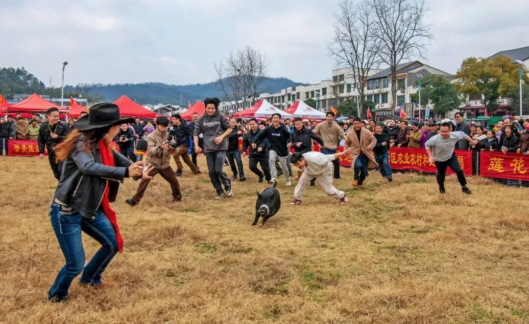 4. 光影与构图自然:阴天漫射光让人物面部清晰柔和,没有强烈阴影干扰;横向构图把人群、猪、环境都框进画面,叙事完整,视觉焦点集中在追逐的核心动作上。